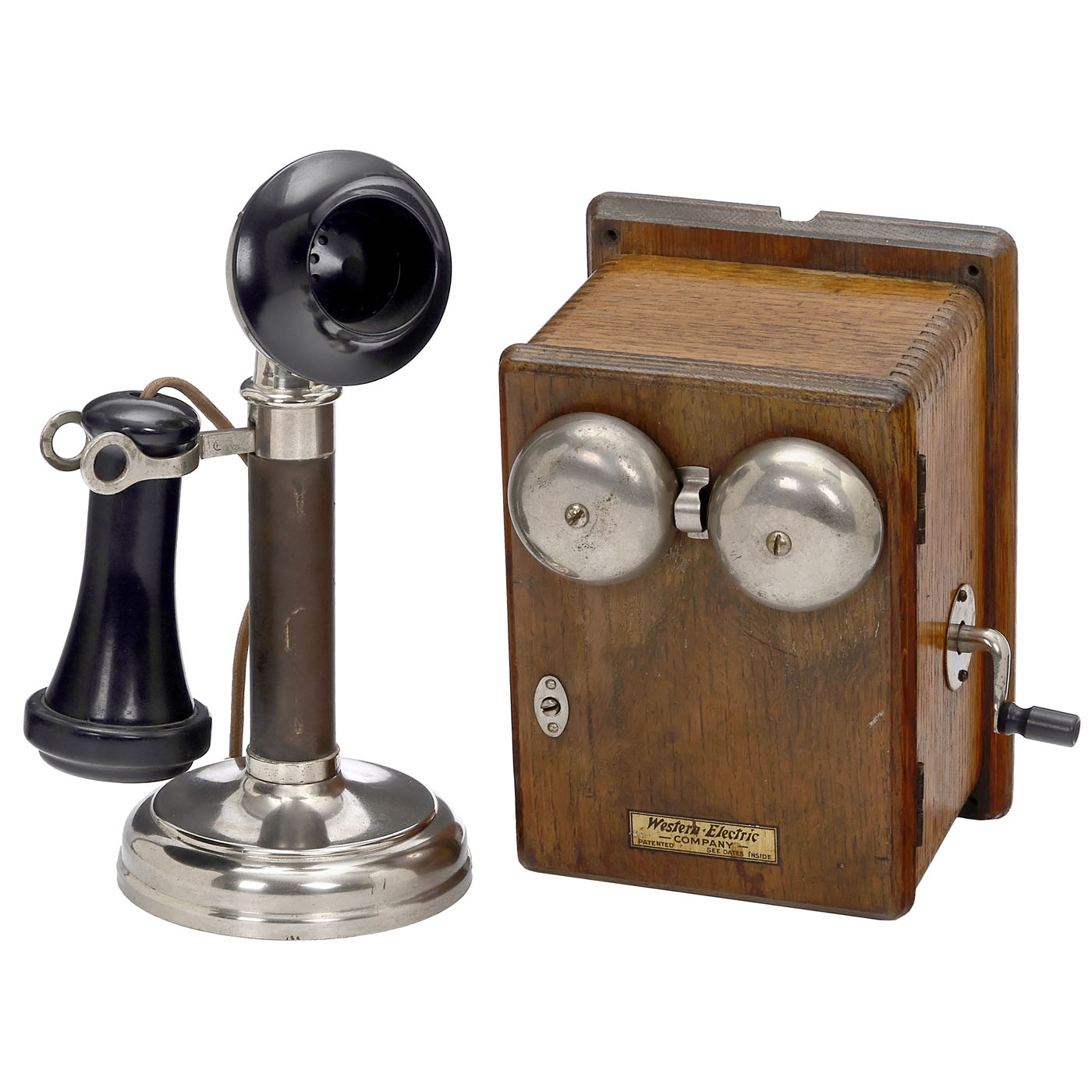 1) Western Electric 20AL Candlestick Set, c. 1920, nickel-plated candlestick phone, Bell-type receiver, oak ring box, three-part crank induction coil.