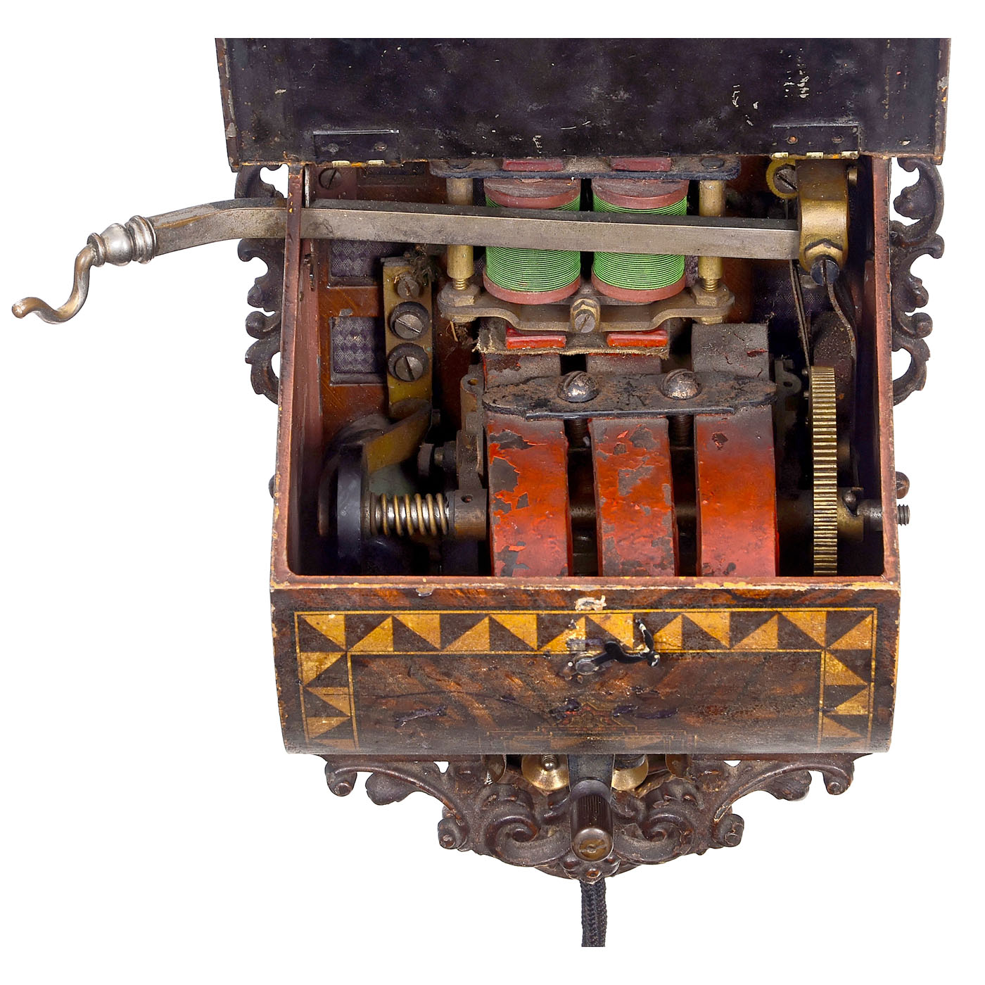 Detailed and decorative cast-iron frame, painted tin case with simulated wood grain, front and writing desk with ornamental transfer, upper oval with manufacturer's name in gilt lettering, three-part crank inductor, lightning protector under the double-bell, handset without bakelite horn mouthpiece.
