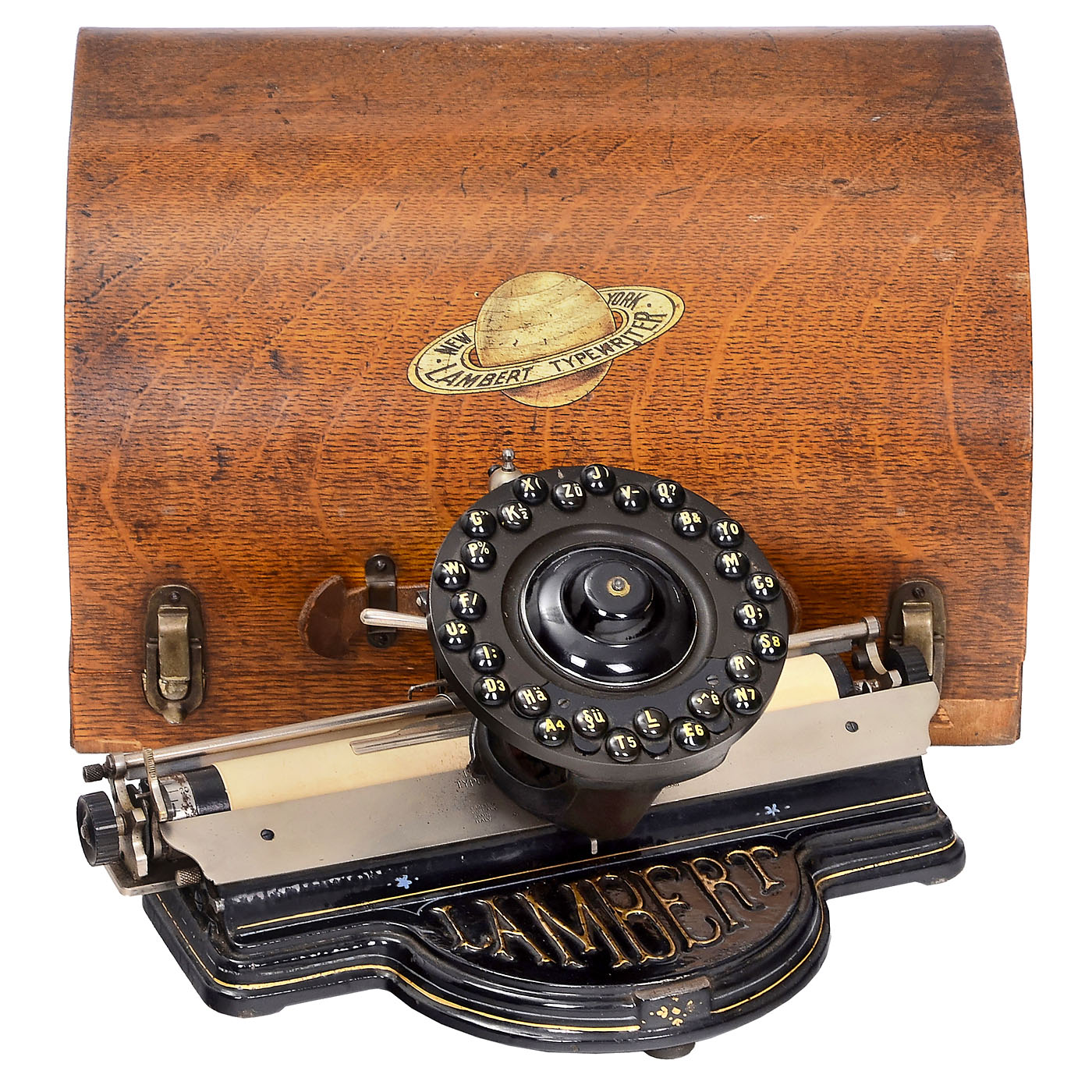 American single-piece rotatable keyboard typewriter, patented 1898. Serial no. 1221. Rotatable keyboard, 28 knobs in a circle, double shift for 84 characters, down-stroke. Cast name on baseplate.