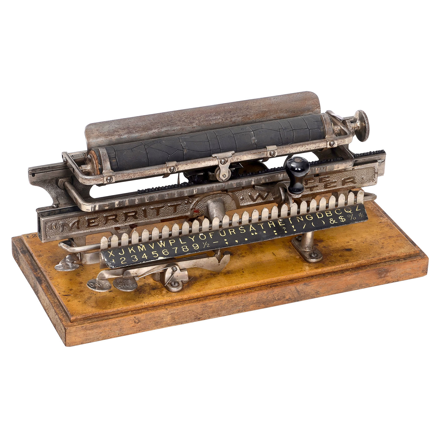 Lyon Manufactoring Company in New York, attractive American index typewriter, serial no. 6659. With ink roller mechanism, sliding steel typebar, on oak base.