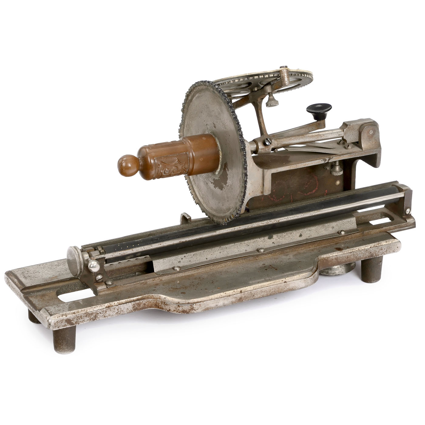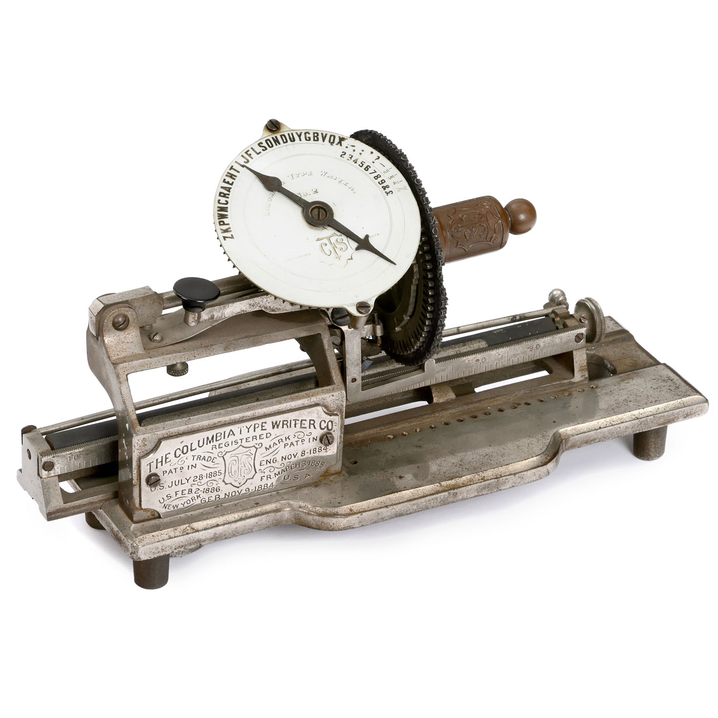 Serial no. 1046, designed by New York watchmaker Charles Spiro (who later invented the "Bar-Lock"), with large typewheel for upper and lower case, set by two different pointers, missing inkpad, carriage movement defective, missing 4 type faces.
