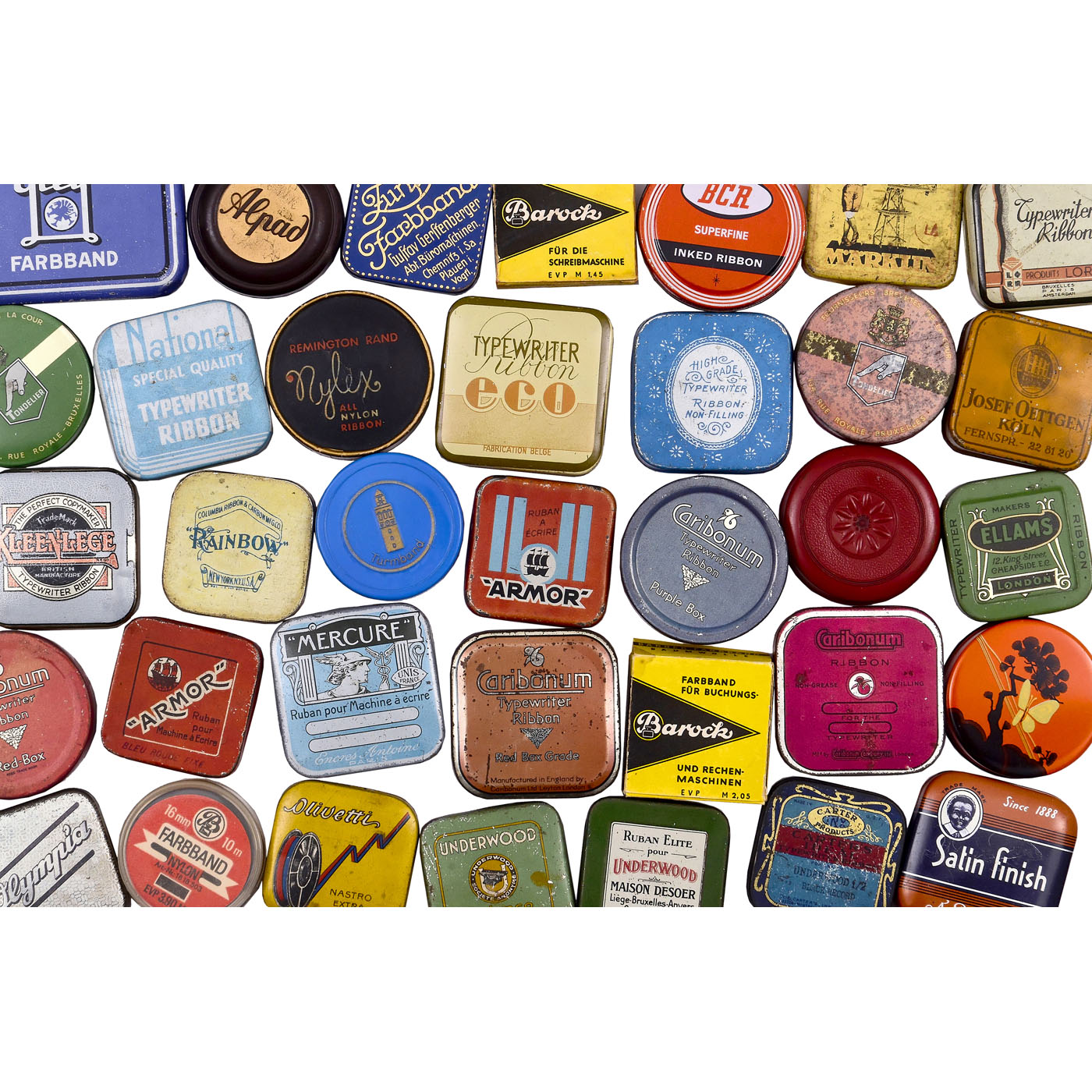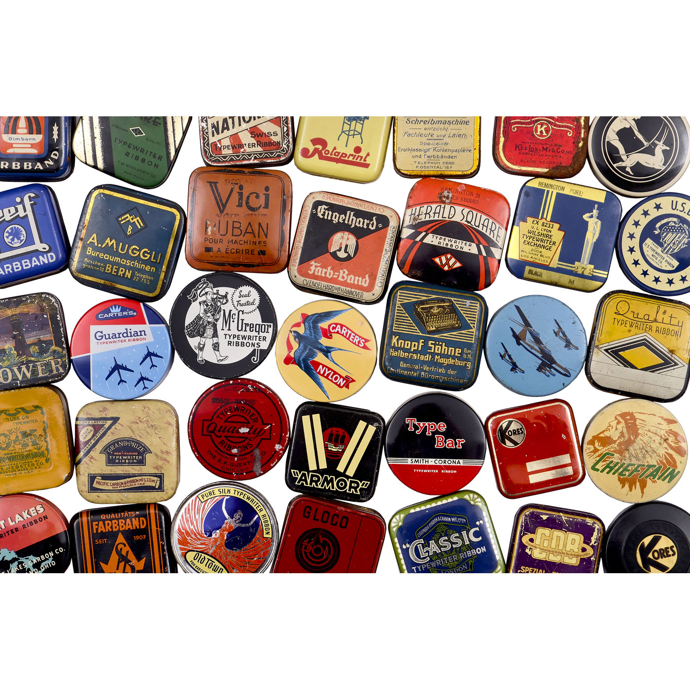 Various brands and manufacturers, lithographed tin, cardboard and bakelite, a few with original wrapped typewriter ribbons.