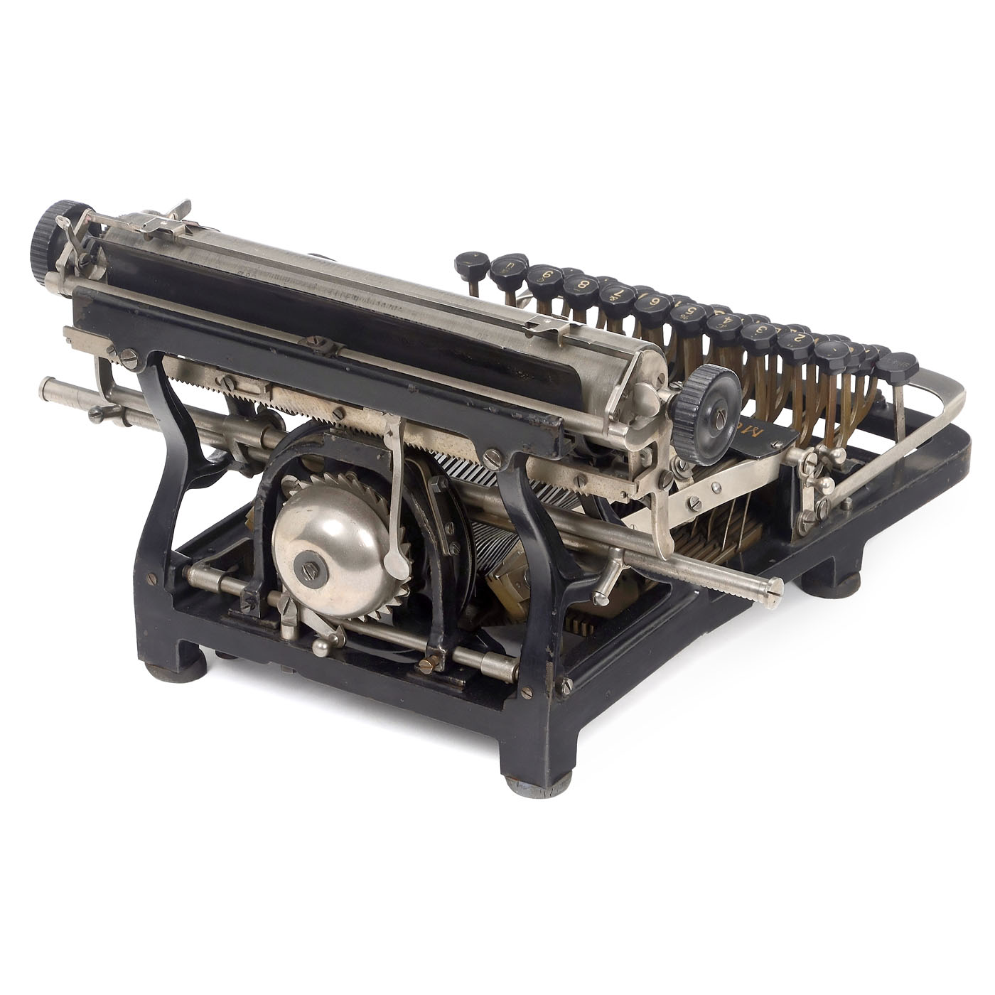 Manufactured by Pittsburg Writing Machine Company. A technically interesting typewriter construction with completely interchangeable typebar system using levers, nickel-plated space bar, integrated shift keys, open type basket, full keyboard in 4 rows.