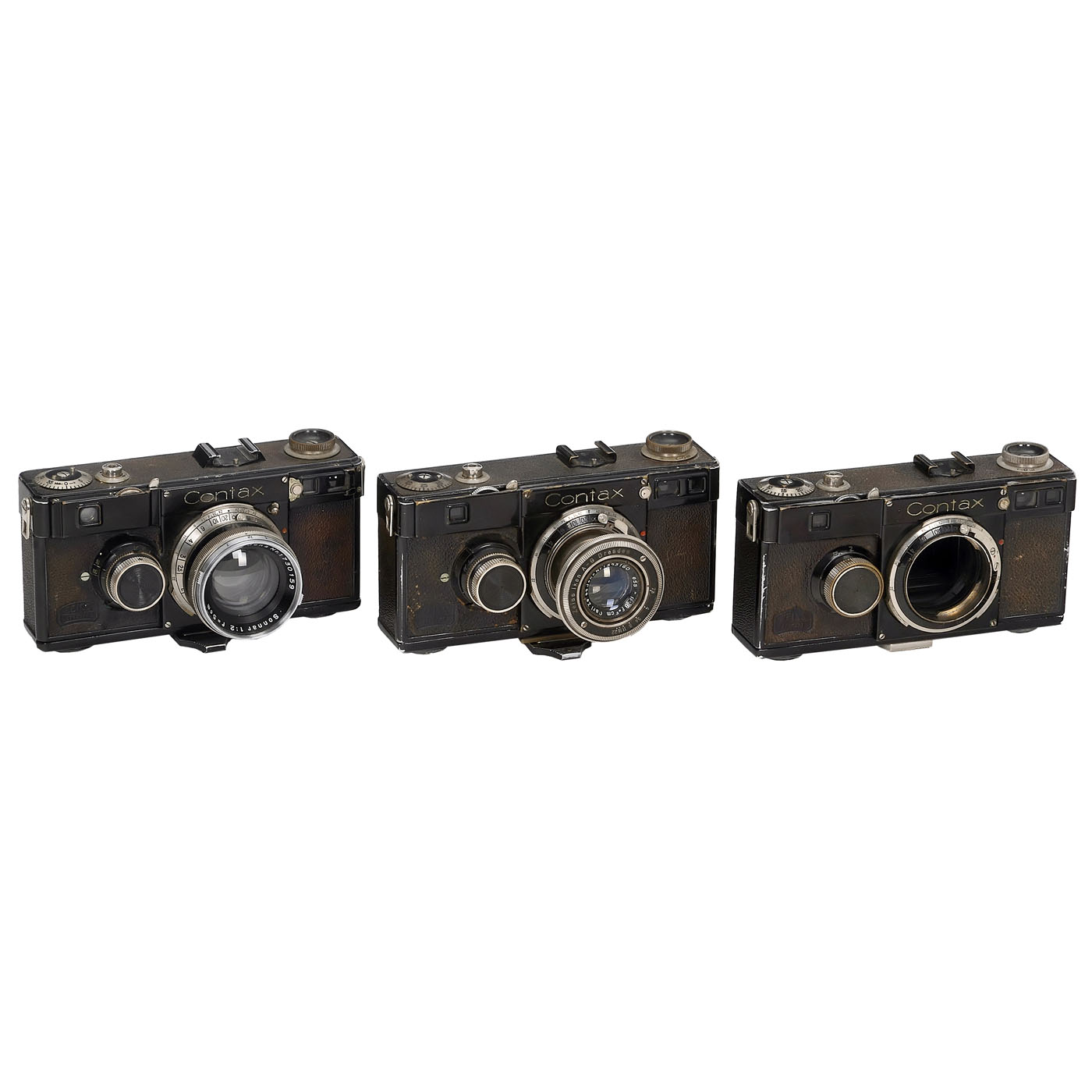 Zeiss Ikon, Dresden. 1) Contax I no. AU 49240, ribbon still in good condition, shutter extremely sluggish, distance meter not visible. (3-/