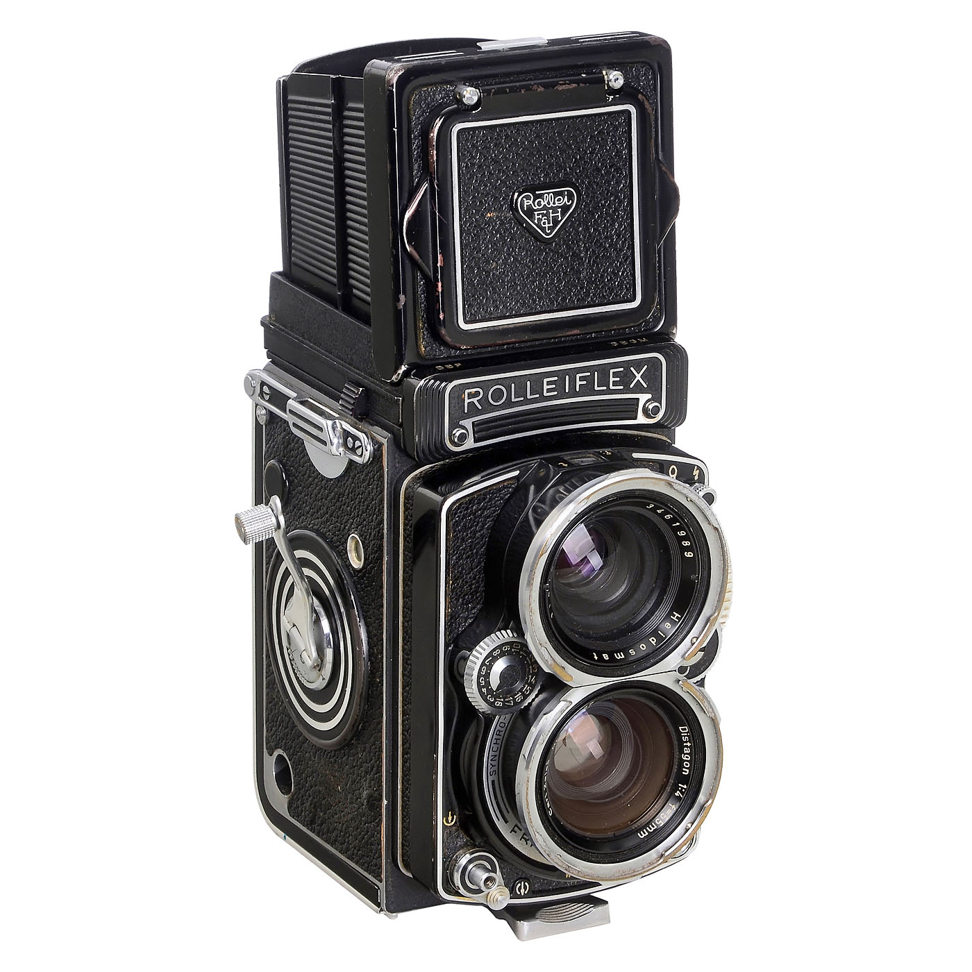 Franke & Heidecke, Braunschweig. No. W 2493102, back with clean plane glass, Zeiss Distagon 4/55 mm, no. 3461487, exterior glass with no signs of cleaning, some age-related deposits on the interior visible under point light, cleaning is worthwhile, with light meter, working, shutter and self-timer working, 1 second slightly too long, focusing works well, filter bayonet with heavy wear and a dent, with case.