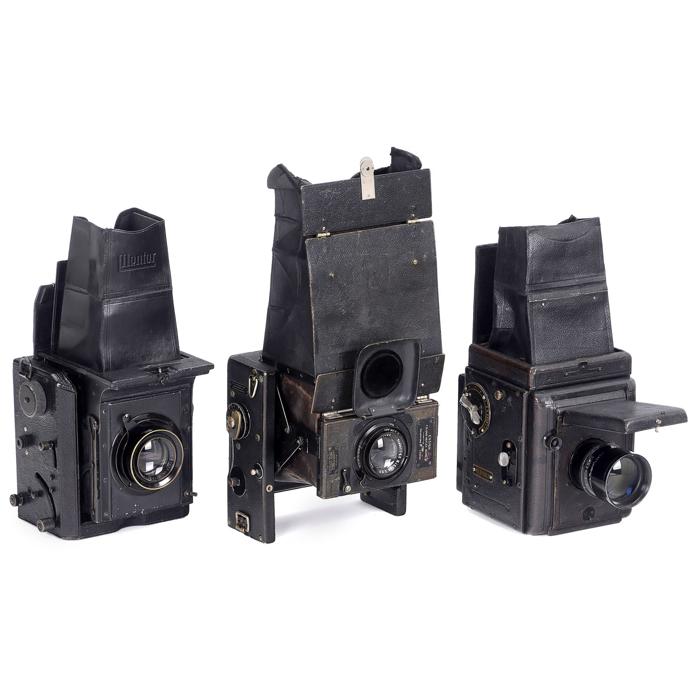 All cameras with a clear reflex focusing screen image. 1) Mentor, Dresden. Sport-Reflex 6.5 x 9 cm, Steinheil Cassar 3.5/12 cm, shutter stuck, with focusing screen back. Rare folding SLR. (3+/