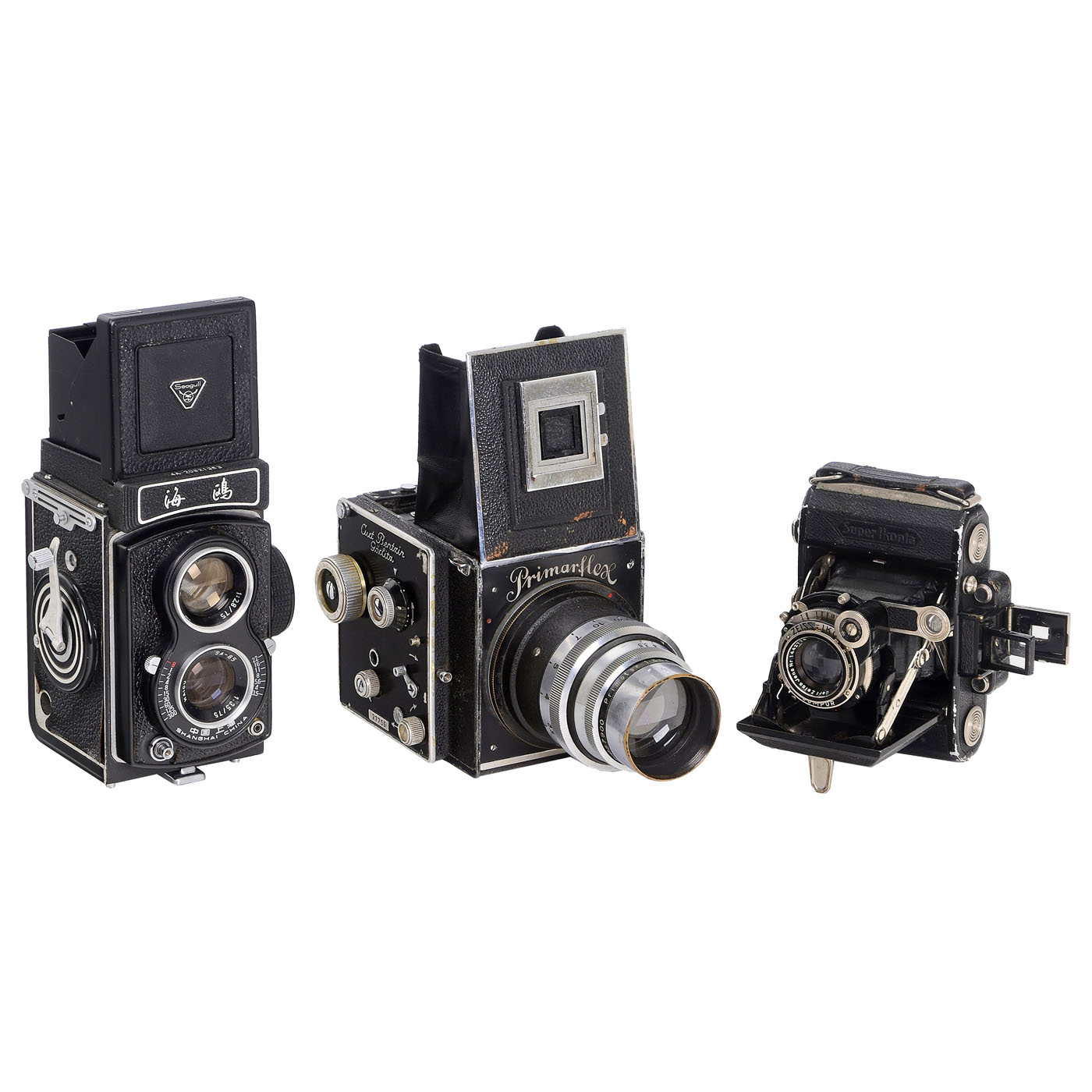 Cameras for 120 rollfilm. 1) Bentzin, G?rlitz, Germany. Primarflex no. 27755, 6 x 6 cm SLR, shutter working! Good mirror, Meyer Primotar 3.5/13.5 cm, good glass. (3-/3)