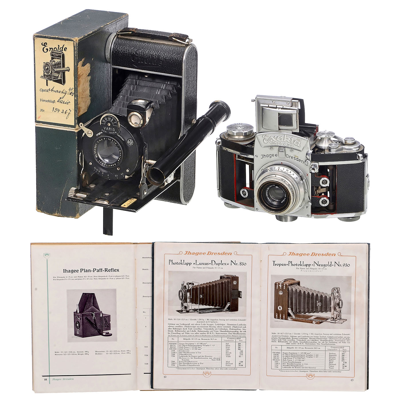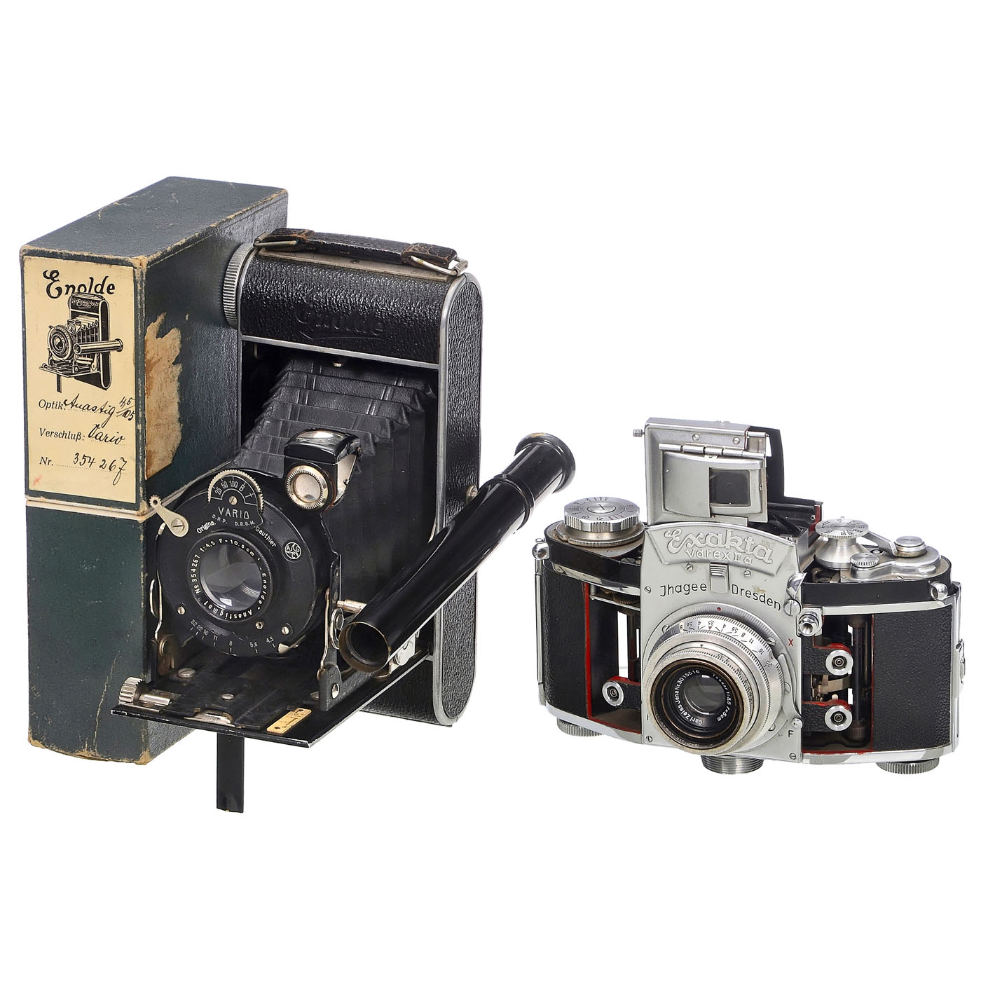 1) Kochmann, Dresden. Enolde, for 6 x 9 cm rollfilm, c. 1930, Enolde Anastigmat 4.5/10.5 cm, Compur working. With the extremely unusual and rare telescope viewfinder, which serves as a coupled rangefinder, it works with outstanding accuracy! With original box and identical serial number. (3+/3+)