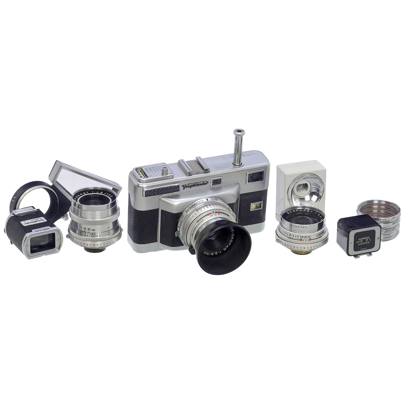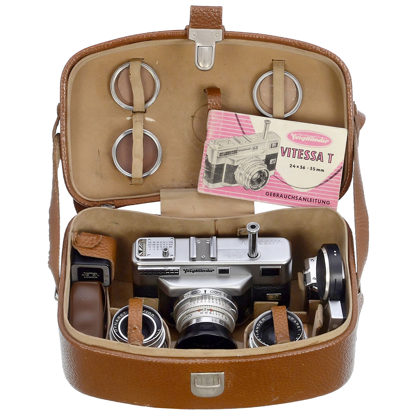 Voigtl?nder, Braunschweig. Vitessa T with Color-Skopar 2.8/50 mm with screw-on lens hood 310/41, exposure meter and rangefinder working, shutter with occasional delay during long exposure times, with Skopar 3.4/35 mm, Dynaret 4.8/100 mm, Turnit-3 viewfinder 35/100 mm, contour viewfinder 35 mm, bulb flash, Proximeter II, 4 filters, camera manual and everything in the original Voigtl?nder universal bag.