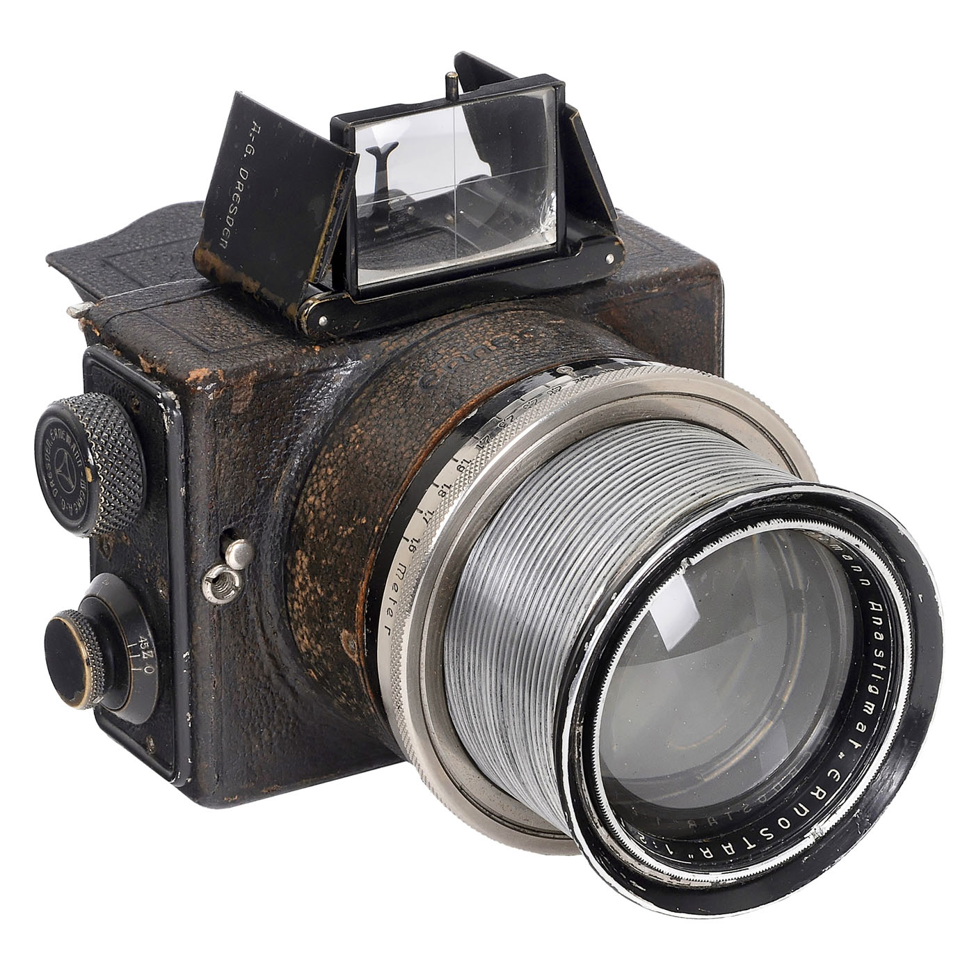 Ernemann, Dresden. No. 1185138 with Ernostar 2/10 cm, no. 150421, glass good under point light, minor cleaning marks. This lens is suitable for users. There is a small break in the viewfinder, 2 screws are missing, and there is no lock for infinity. The shutter occasionally releases at T; at all other speeds, the two shutter parts do not separate and do not engage when wound up. With original focusing screen back.