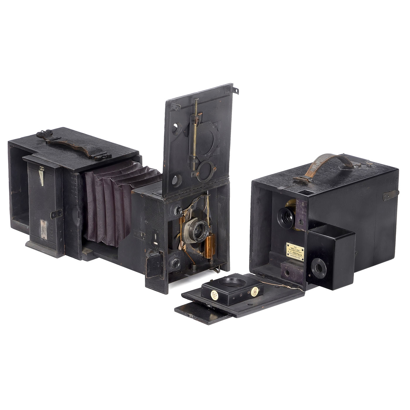 Both lenses are clean under point light. 1) Newman & Guardia, London. Universal Special Pattern B, no. SB 1438, c. 1905, for 4 x 5 in., dark purple bellows, shutter somewhat stiff, Zeiss Jena Protar lens 285 mm (front and rear lenses), configured for use of the rear lens as a telephoto camera, with focusing screen and interchangeable lens bag.