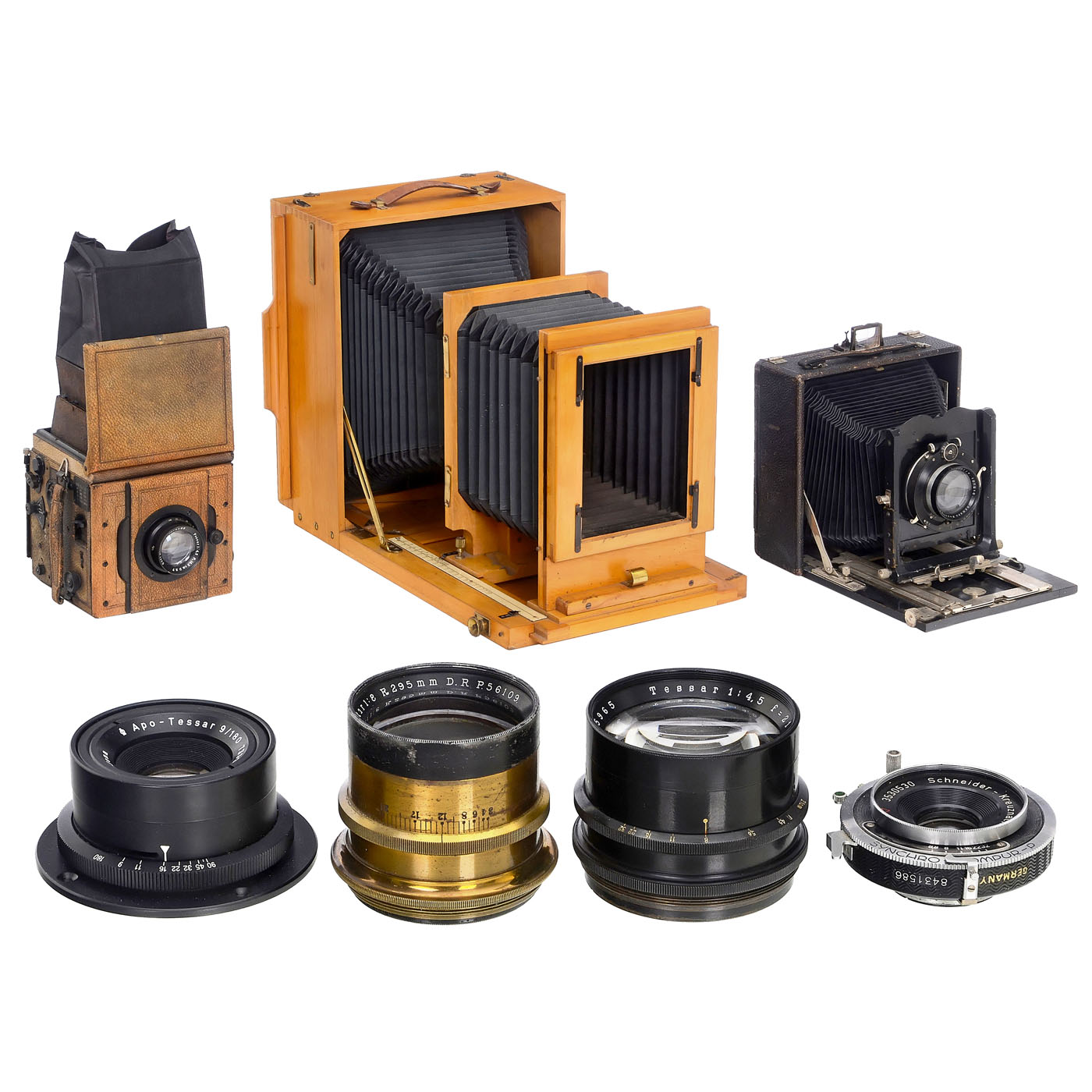 1) Ernemann, Dresden. Heag 13 x 18 cm, double extension, interchangeable back, with interchangeable Ernoplast 4.5/21 cm, Compound, all times the same, with focusing screen back. (3-/3-)