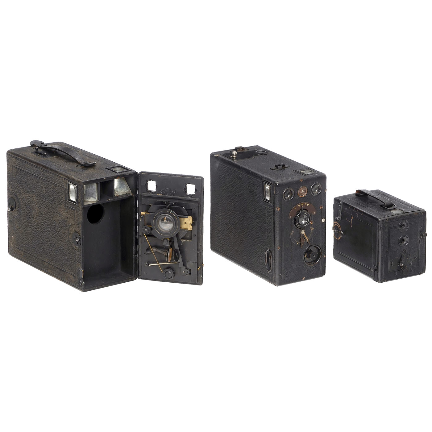 1) Murer & Duroni, Italy. Express Newness, c. 1900, for 8 x 8 cm, guillotine shutter P, T and 2 shutter speeds, 3 pinholes, and 4 inserts. Very small and delicate magazine camera. (3+/3+)