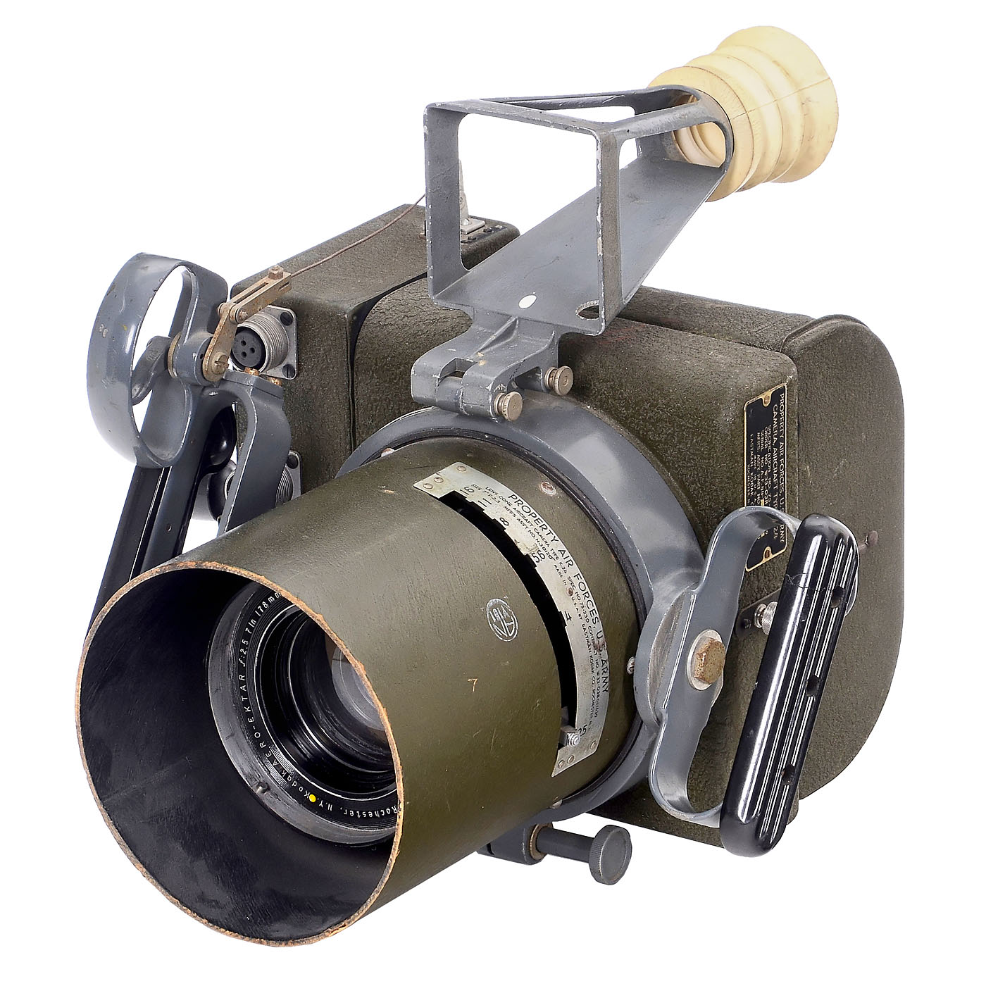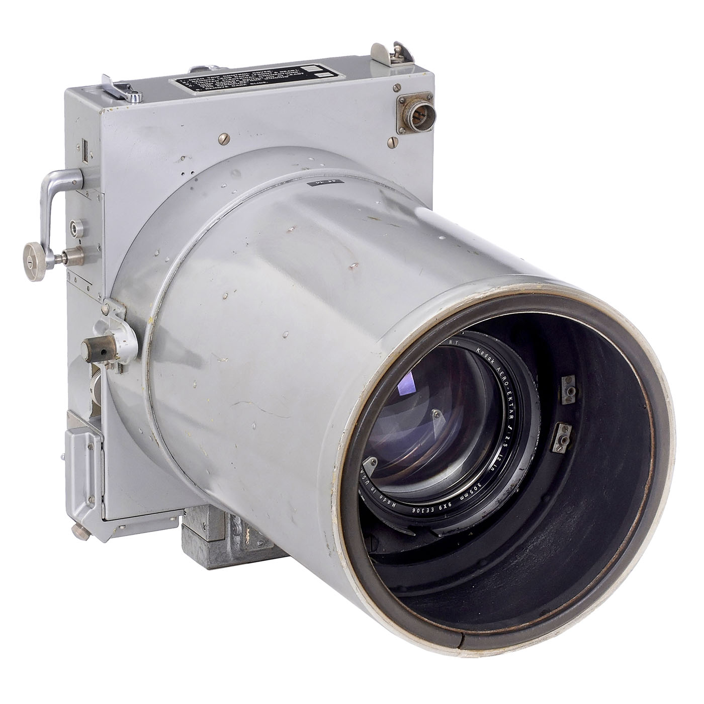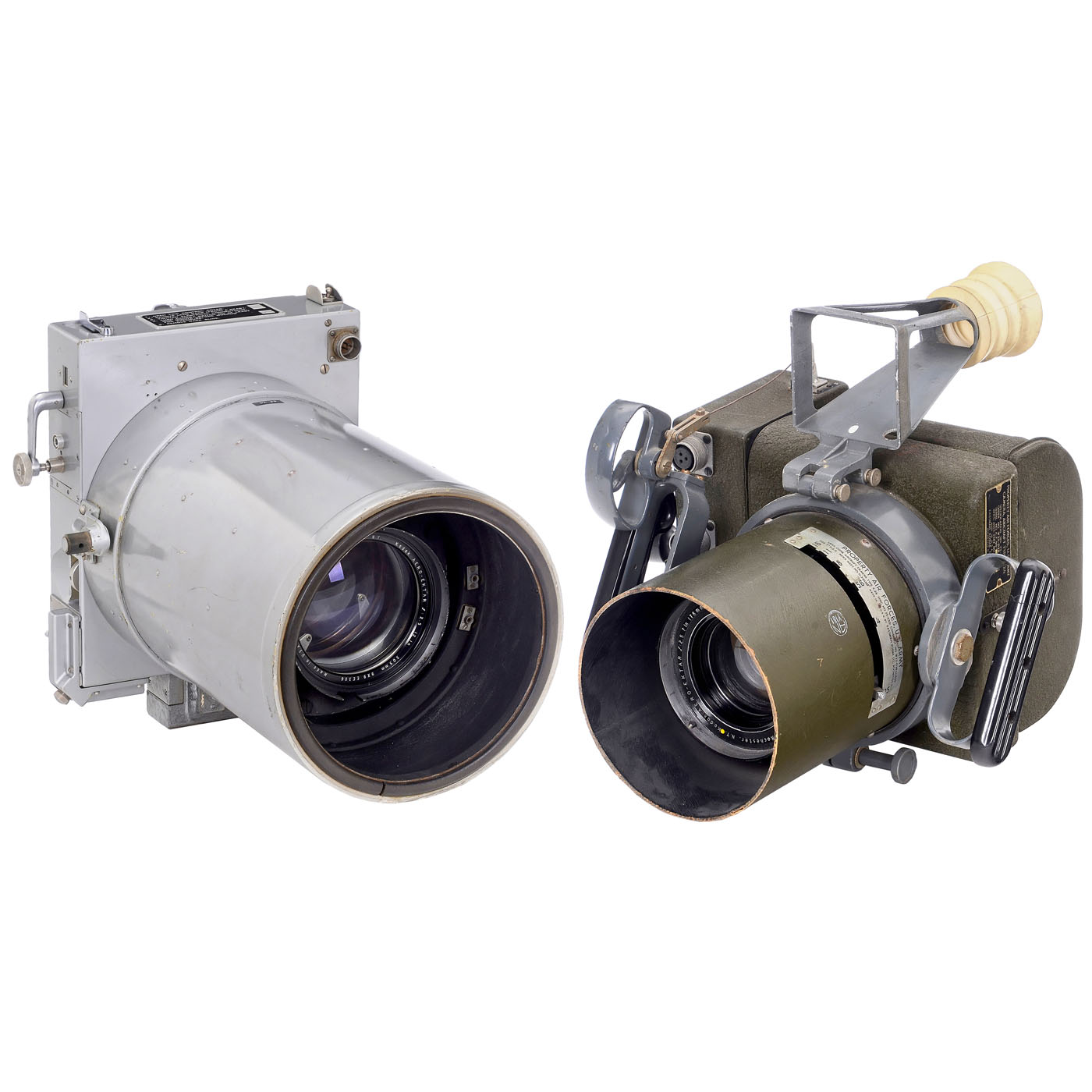 Eastman Kodak, USA. Point light testing not possible because the original lenses are still installed. Electrical functions not tested. 1) Camera Aircraft Type K-24, with Aero-Ektar 2.5/178 mm no. EE 17451 for 5 x 5 in., yellow dot, back with the 4.9 mm thick glass pressure plate, which is usually missing, focal plane shutter releases, with removable film magazine.