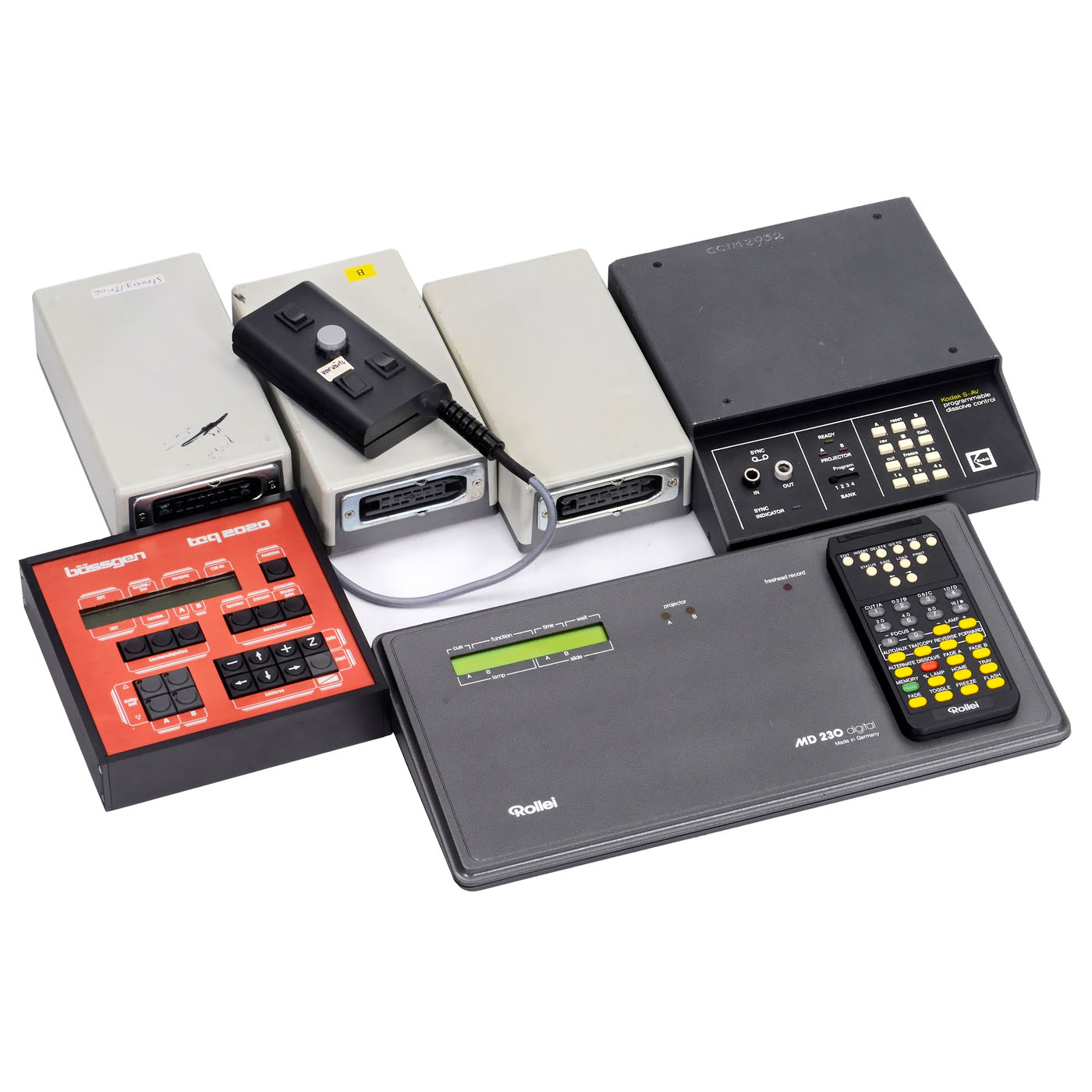 G?tschmann, Munich. Two projectors for 6 x 6/6 x 7 cm slides in 85 x 85 mm frames. The two Schneider AV-Xenotar 3.5/90 mm MC lenses are both individually adjustable in the xy directions, with polarizing filters, and the illumination can be boosted to 230 and 240 volts. Both projectors working. Quote from the brochure: "The useful luminous flux is 6000 lumens. The G 8585 AV67 is the world's brightest blending projector with a halogen lamp." Both with magazine and test slides from the previous owner. 3 different dissolve control units (not tested): a) B?ssgen TCQ-2020 with 61-page manual, b) Kodak S-AV programmable dissolve control, and c) Rollei MD 230 digital with all accessories and 38-page manual, plus 3 control triacs with special G?tschmann connectors, G?tschmann brochures, a 4.9 x 1.54 m projection screen (according to the consignor, suitable for polarized stereo), as well as approx. 200 (estimated) pairs of polarized stereo glasses and 22 additional magazines for 58 to 64 slides (all can be individually adjusted to accommodate the required number of slides). Broadband adapters using an Isco-G?ttingen Iscorama 1.5x anamorphic lens were also planned (two in good condition, also suitable for recording). A unique opportunity to directly acquire what is probably the most perfect 6 x 6 stereo projector for a large audience with accessories. Anyone who works with 120 film now has the opportunity to purchase one of the last top professional slide projectors, as no new devices are being built anymore!