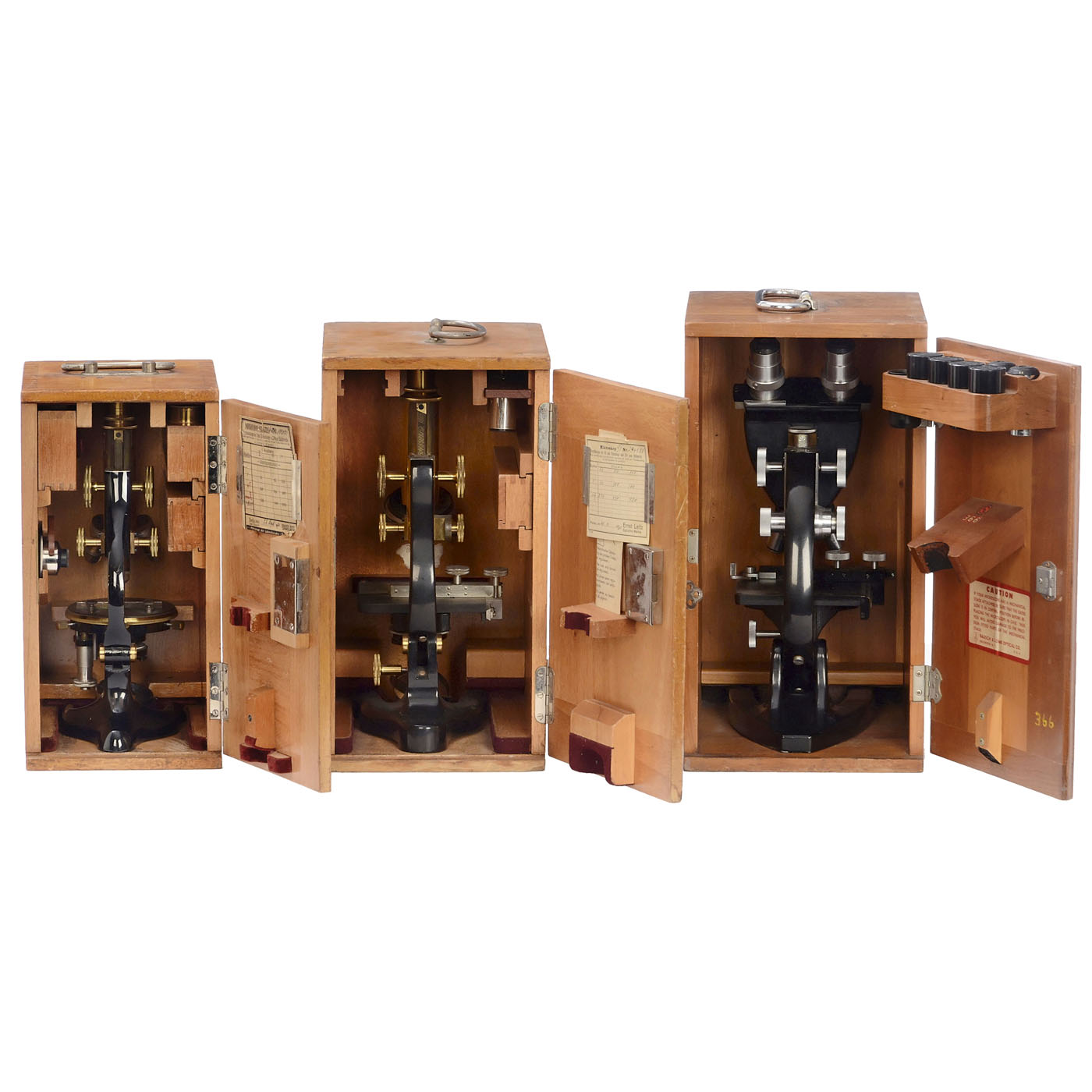 1) Leitz student microscope, Jena, 1930, dated on magnification table 30.9.1930, serial no. 294588, lacquered brass, black-painted iron horseshoe base, 3-lens turret, condenser with iris diaphragm, coarse and fine adjustment, 3 lenses, 2 oculars, height 12 ? in., in wood case with identical serial number.