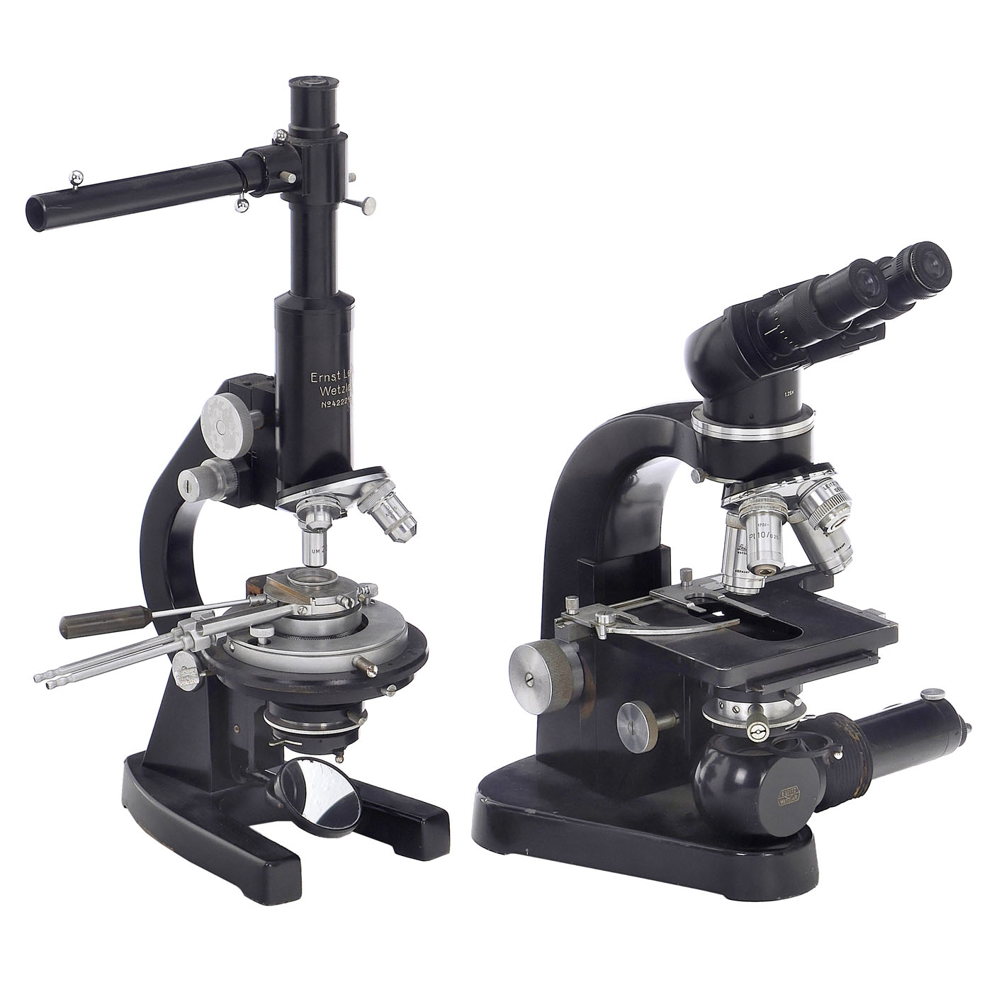 Wetzlar. 1) Laborlux SM, binocular microscope, no. 496227, 1956, electric illumination, condenser, rectangular stage, quadruple turret with objectives, binocular tube l.25x, height 36 cm.