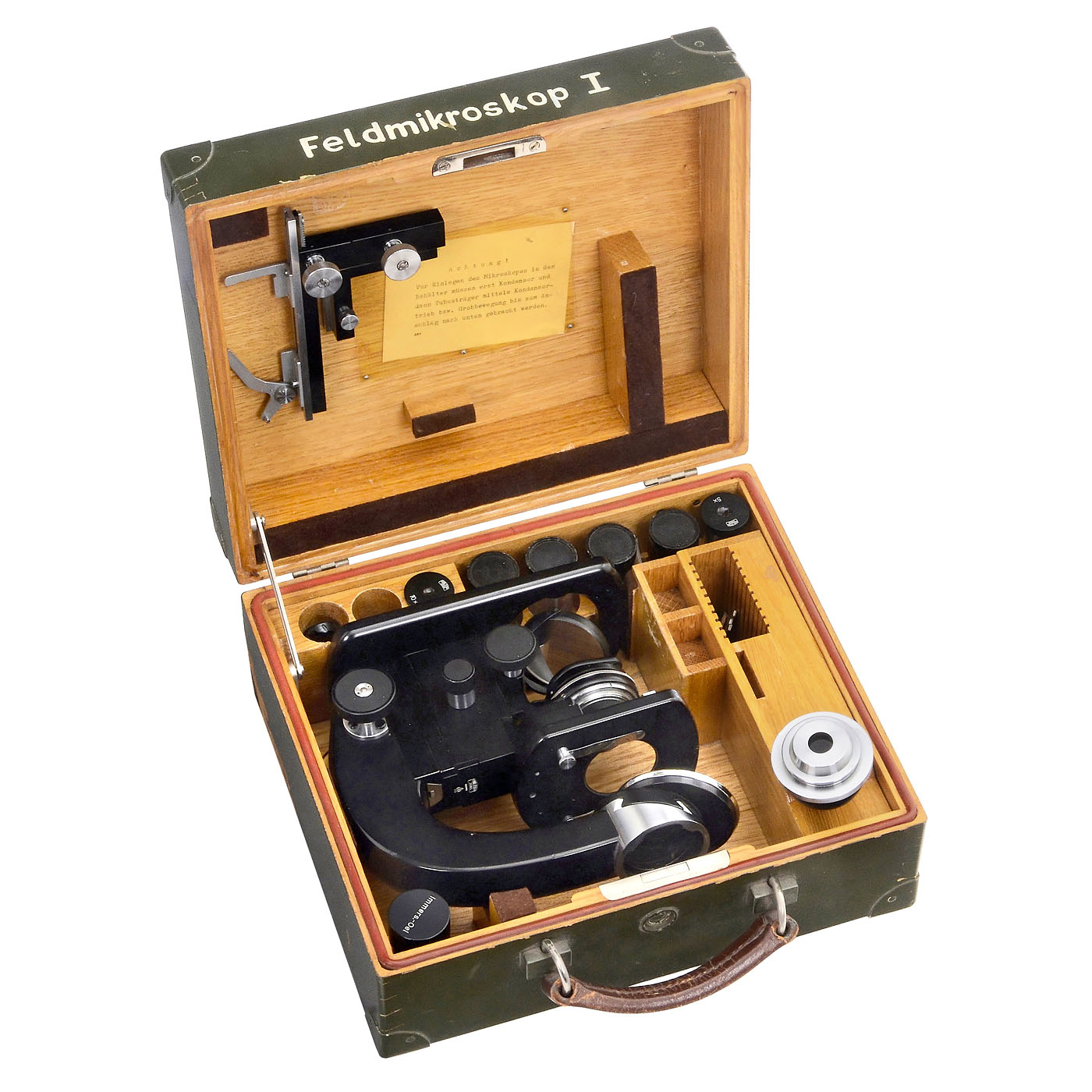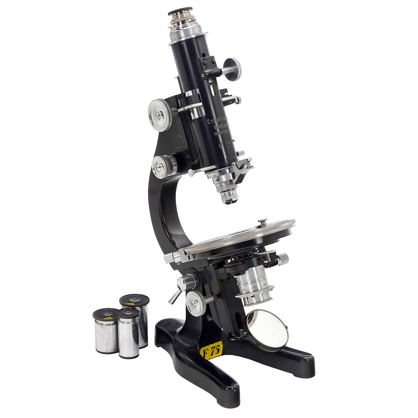 1) Polarising microscope model CM, Ernst Leitz, Wetzlar, 1938, no. 335721, with Ahrens prism polariser condenser and an Ahrens prism analyser, Bertrand lens, tilting stand, double mirror, coarse and fine drive, height 38 cm, in box.