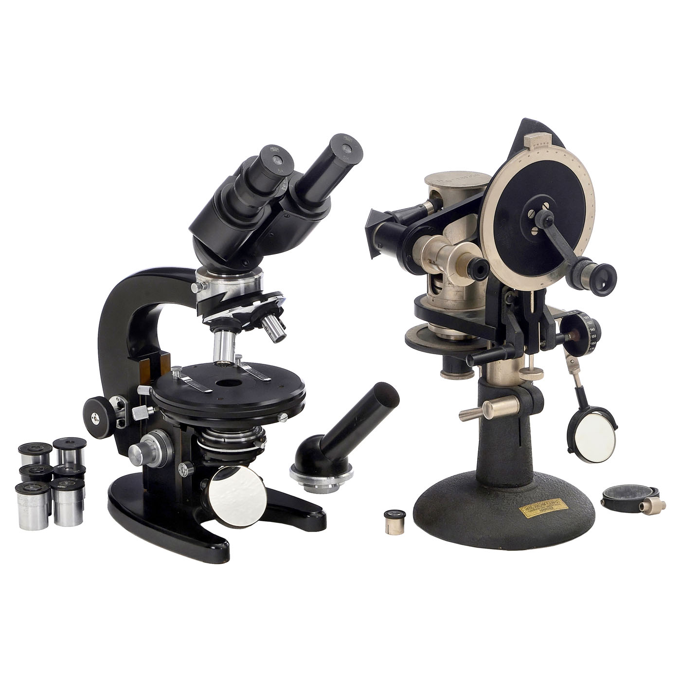 1) Microscope, Carl Zeiss, Jena, model LgOB1, c. 1965, no. 320945, two tubes (binocular and monocular), quadruple nosepiece, condenser, double mirror, with 3 objectives and 8 eyepieces in case, all drives running smoothly, height 32 cm.