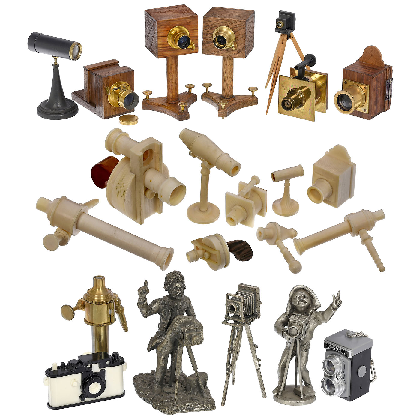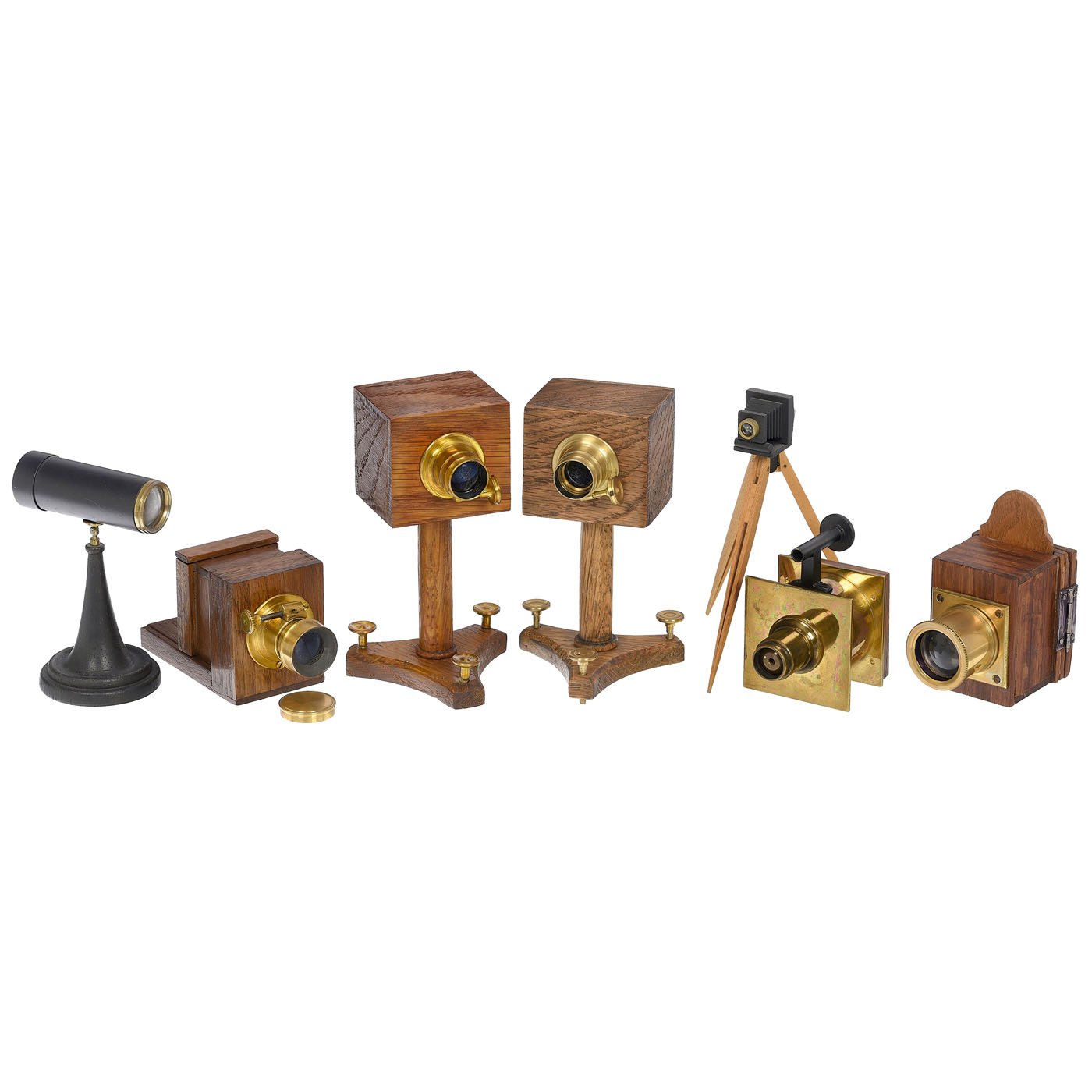 1) Sliding box camera replica for 20 x 28 mm, with sharp single lens, stiff drive, box extension up to 1 m distance, focusing screen back removable, can be used for photography, with cap.