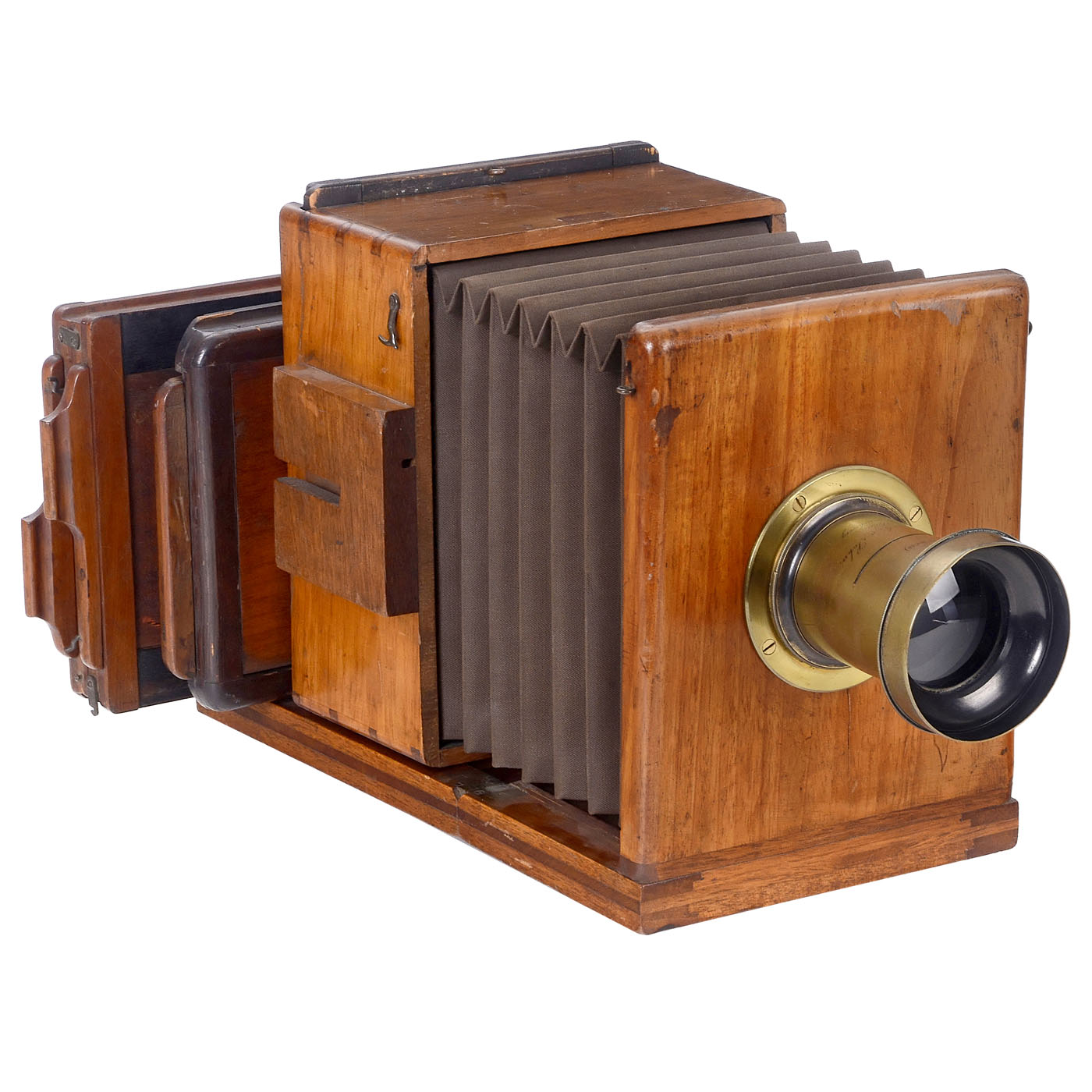 Germany or Scandinavia. Attractively colored walnut, for 13 x 18 cm plates, brown fabric bellows, unusually long back (presumably as a transport case for equipment such as the lens), missing locking screw, extension to 37 cm, with "Voigtl?nder Wien Braunschweig Euryscop No. 3 Nr. 30688", approx. 7/28 cm, a very minor scratch on the front lens, otherwise the glass is clean under point light. The two slotted wooden adapters on the bottom and side of the back for quicker tripod attachment are very unusual, previously unknown. Includes a double cassette, a studio cassette, and a non-original, but very old, matching focusing screen back. From the early days of amateur photography, when professional photographers were skeptical of formats as small as 13 x 18 cm.