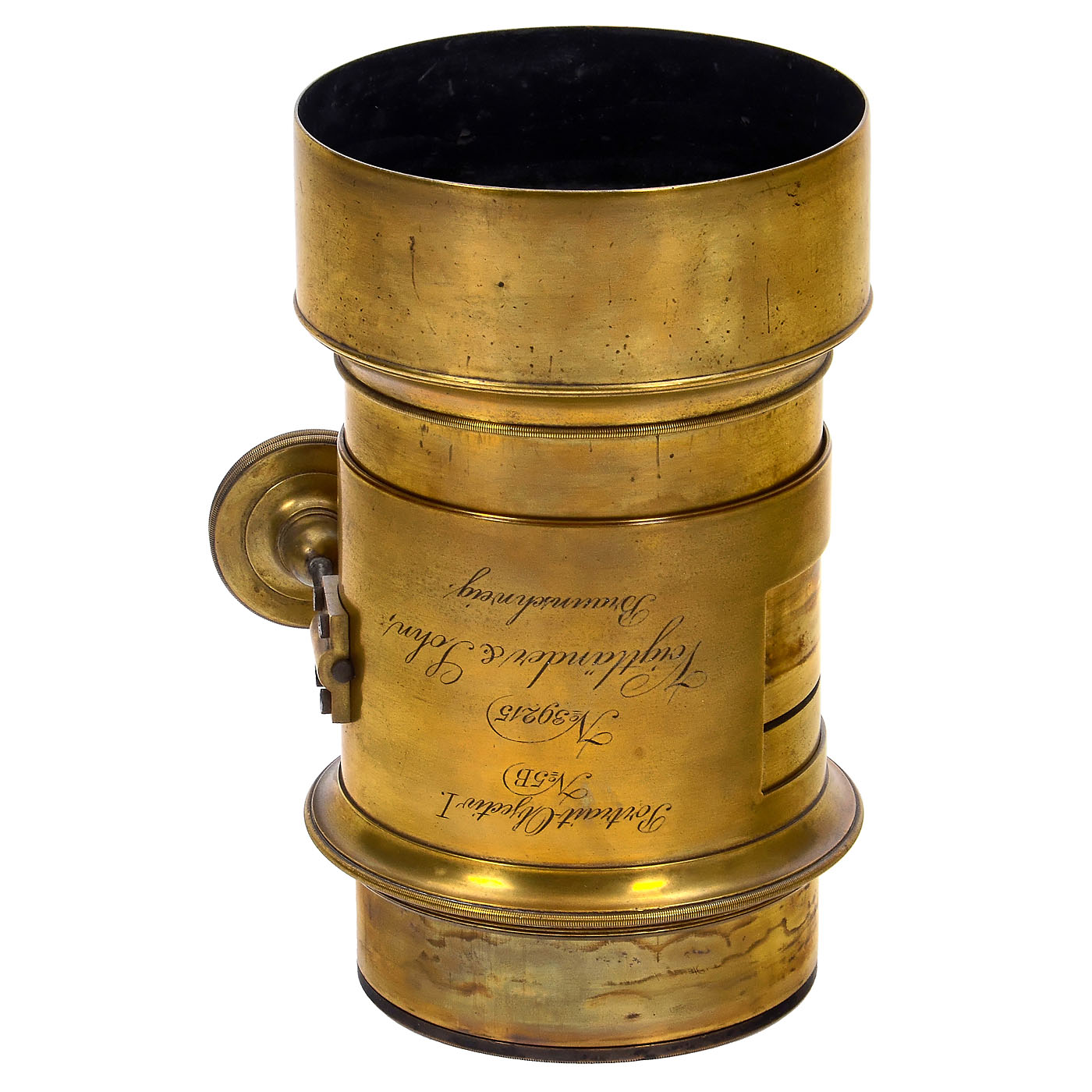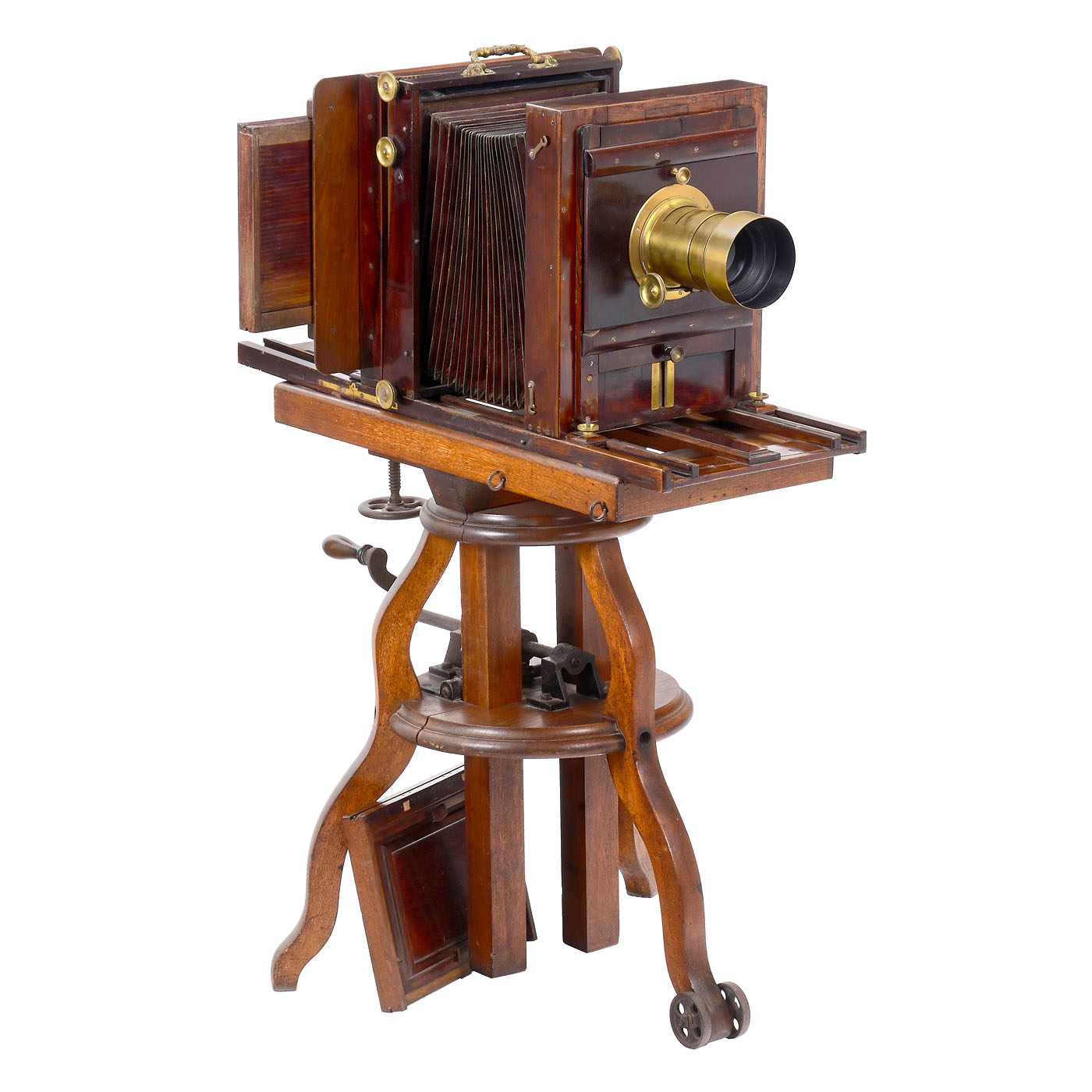 Germany. Camera and tripod made of dark walnut, studio tripod with tilting table 36 x 71 cm, height adjustable by crank from 80 to 110 cm, studio camera baseplate 34 x 89 cm, tilting back (one screw missing), which was reduced to the 12.5 x 20.5 cm focusing screen back for the interchangeable slide holder, front standard inside with additional holder for shorter focal lengths, behind it a little flap shutter, at the very front intended for larger lenses (lens board recently supplemented) with Voigtl?nder Portrait-Objectiv I No. 5B no. 39215, Petzval-type, with screw-on ring. Glass clean to good under point light, a small putty defect of approx. 3 mm at the front. With the two matching studio cassettes, which are designed for plates up to 274 x 210 mm, inside with reducing inserts.