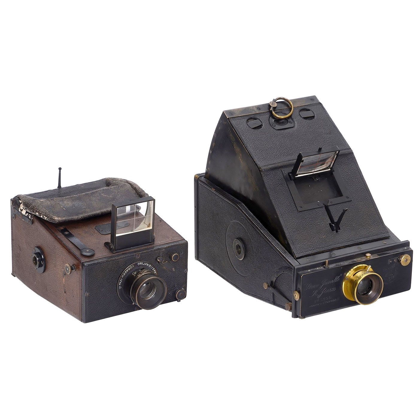 Small, delicate magazine cameras for 6.5 x 9 cm plates. 1) "Vega S.A., No. 40 2", Geneva. Le Vega, with lens by "N. Hansen, Rue du Pont de fer, Paris No. 140, F 110 mm Anastigmat 1:8 verres de Jena". The shutter works, the shutter release is extremely shake-free and reminiscent of the Agfa Sensor from 1980, the back has a counter, the inside contains 12 inserts, and the changing bag has fading. A rare camera from a famous manufacturer.