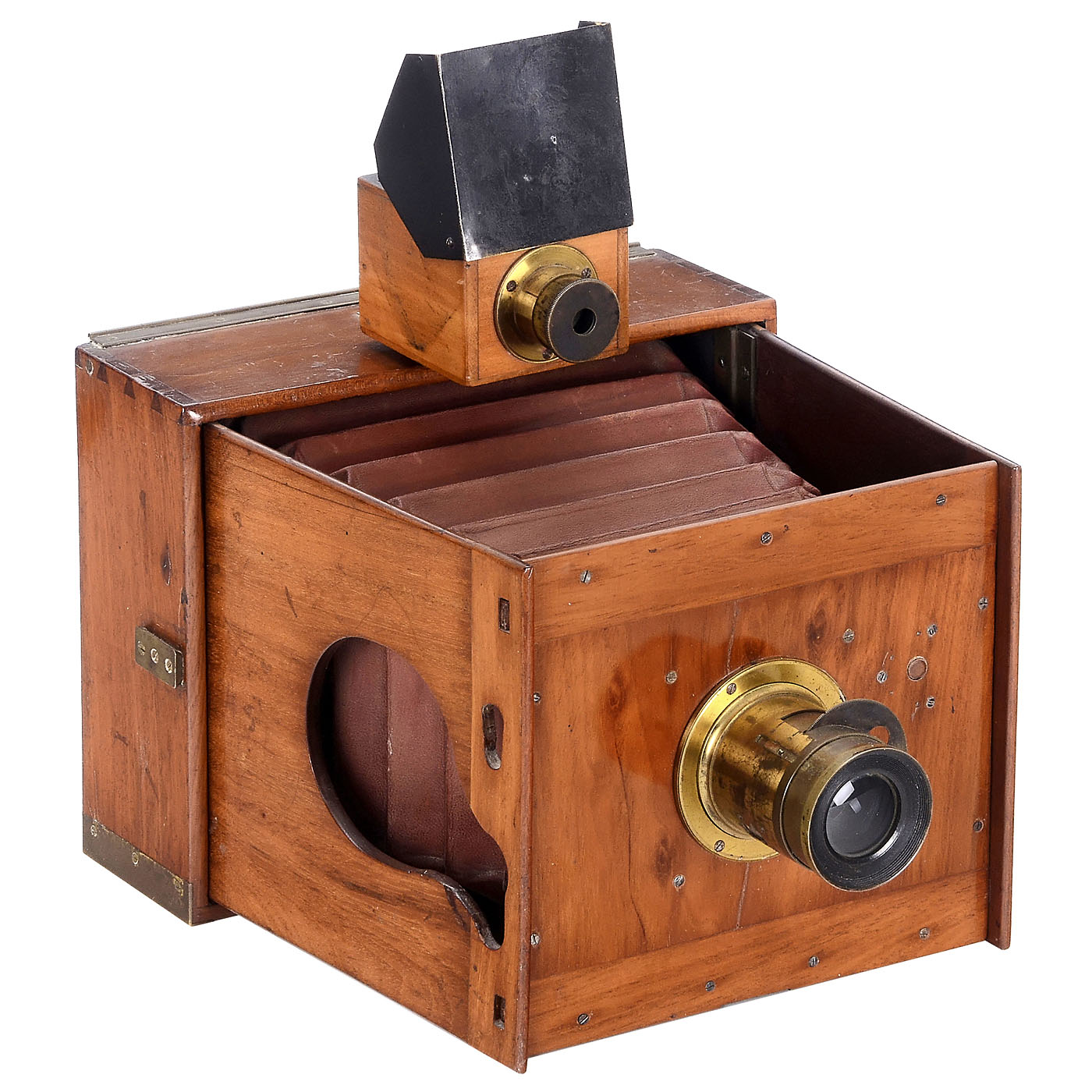 E. Fran?ais, Opticien-Constructeur, 3, Rue du Chalet, Paris. For 13 x 18 cm, mahogany with brass fittings, reddish-brown bellows, with E. Fran?ais Aplanat lens 8/23 cm in a bayonet mount for quick interchangeability, 4-way revolving aperture, focusing drive missing, distance scale on both sides. Behind the front plate: a Thornton-Pickard shutter. On the back: fold-down protective screen with removable focusing screen back. On the top or side: large reflex viewfinder with an adjustable focusing screen. Decorative, beautiful camera!