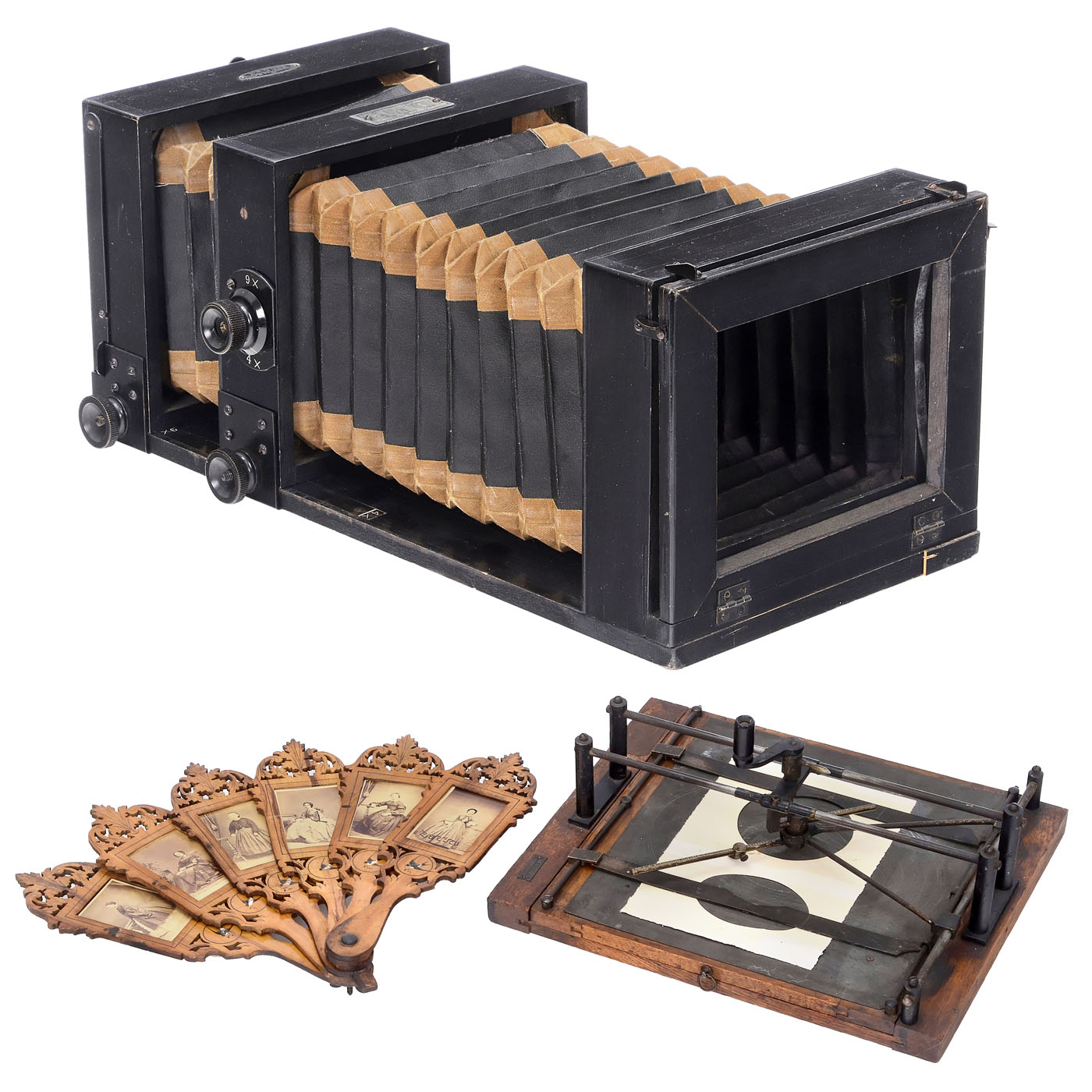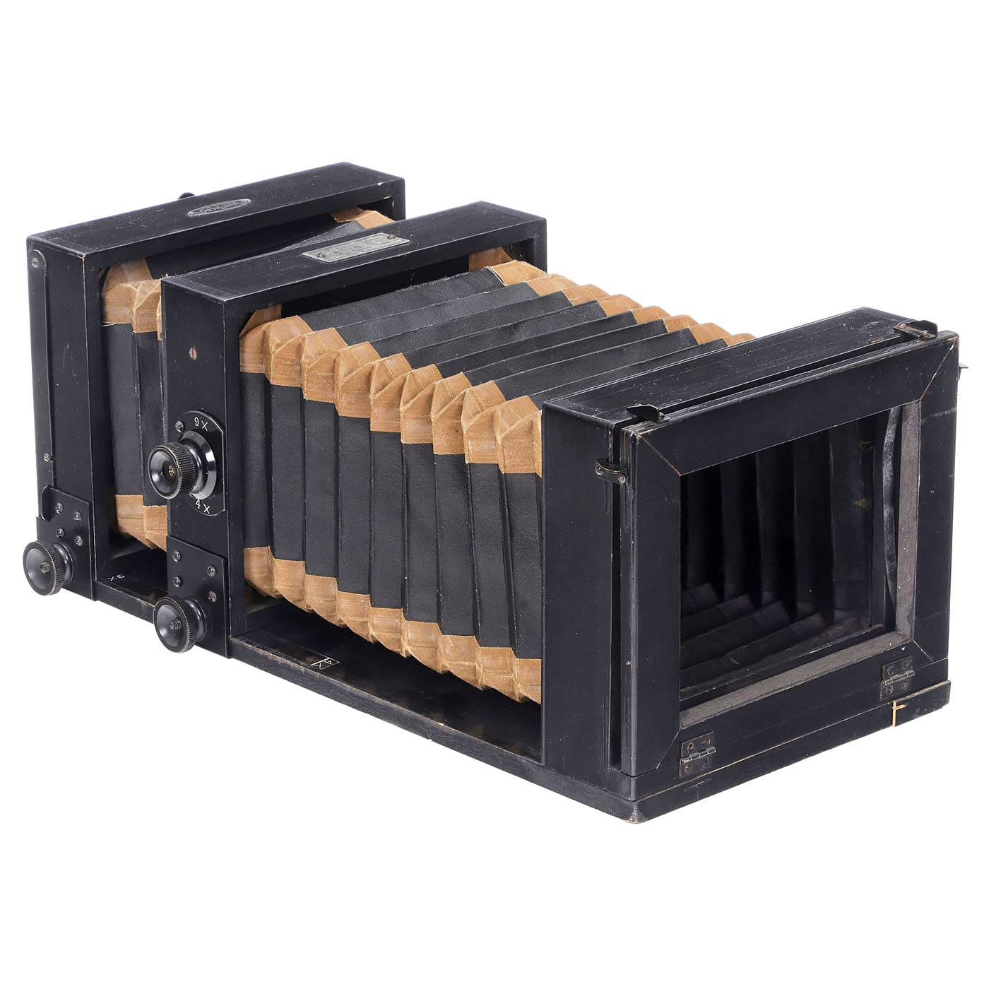 1) Franz Talbot, Berlin W. 15. Stamp camera for 4x or 9x simultaneous reduction of a 9 x 12 cm negative to 9 x 12 cm for 4 or 9 stamp sized partial images (switching is somewhat difficult). Length 34 cm, optical center section and back section movable, the back section bears the name "Franz Talbot Berlin W. 15" and a "D.R.P." label, well preserved.