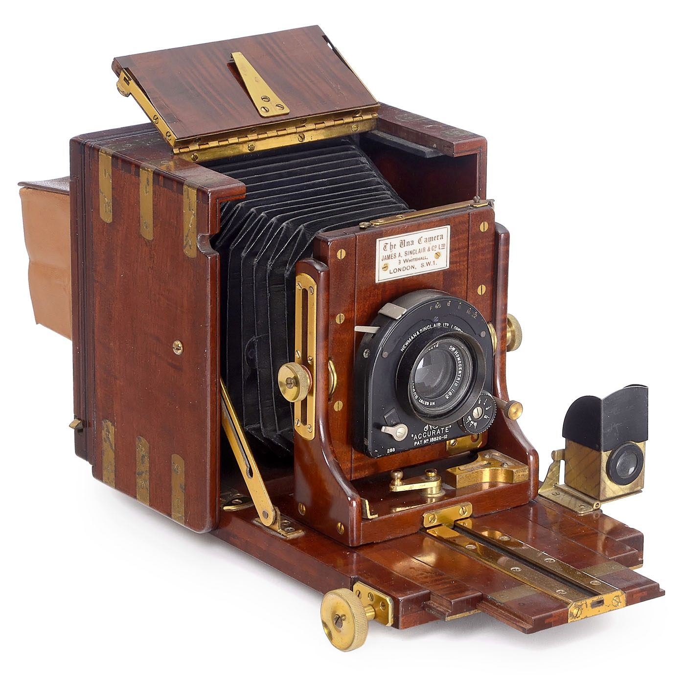 James A. Sinclair & Co Ltd, 3 Whitehall, London. For 76 x 101 mm plates, dark red mahogany, triple extension, camera body foldable for tilting front, Ross Homocentric 6.3/5 in. no. 63797 in Newman & Sinclair shutter "Accurate", working, with focusing screen back, in good condition and fully functional!