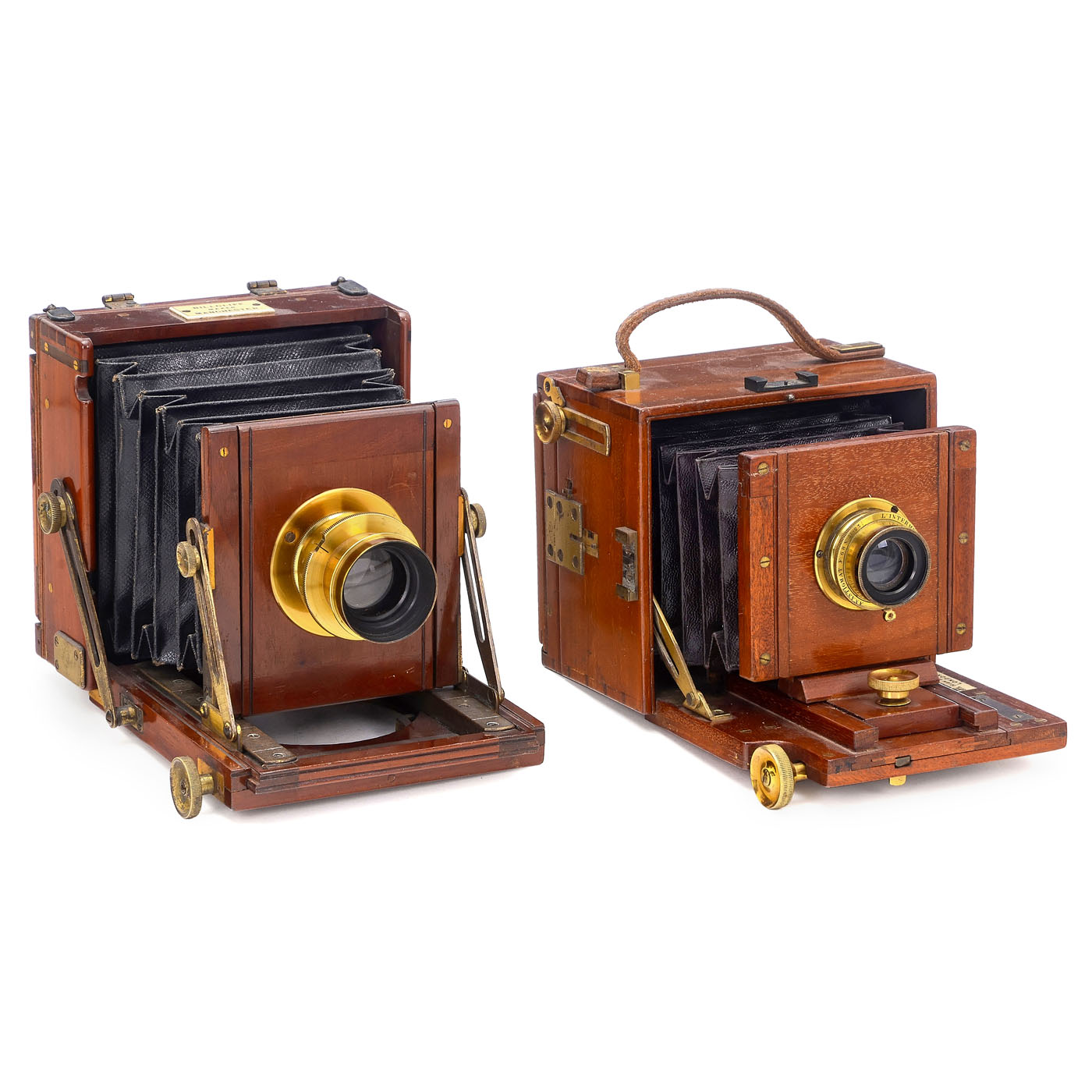 Solid English camera constructions, both: mahogany with brass fittings, double extension, black bellows, clean brass lenses, for the 7.7 x 10.3 cm plate format and with original focusing screen back. 1) W. Watson & Sons, London. Folding camera for landscape format with a back that can be pivoted on two axes (top and center). Special version with a standard of vertical adjustment from the start by approx. 1 cm at the customer's request. The standard is loose and should be reglued. Lens "L'Interm
