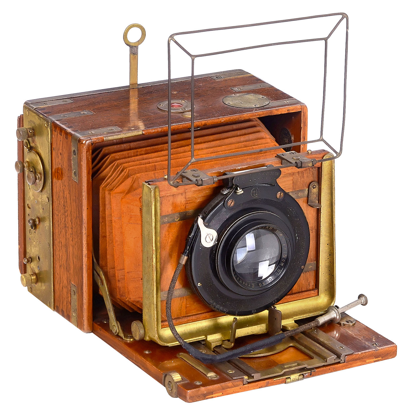 Ernemann, Dresden. Double-shutter tropical folding camera, made of walnut with brown bellows (two tiny cracks) and brass fittings, for 9 x 12 cm. The rear wooden frame bears the number 805387, Ernemann Ernotar 4.5/15 cm, central shutter working, focal plane shutter with both movable shutters and partial functions, French shutter speed table presumably added later, double extension, working bubble level, original frame viewfinder, and original focusing screen back.