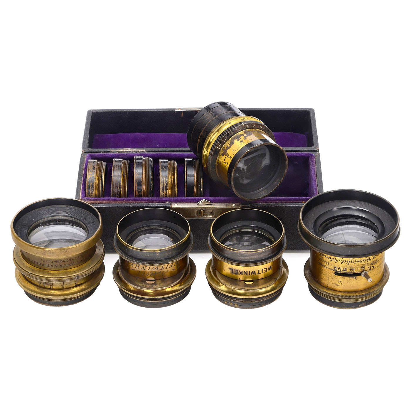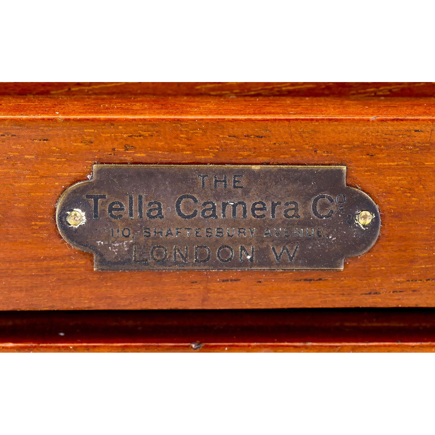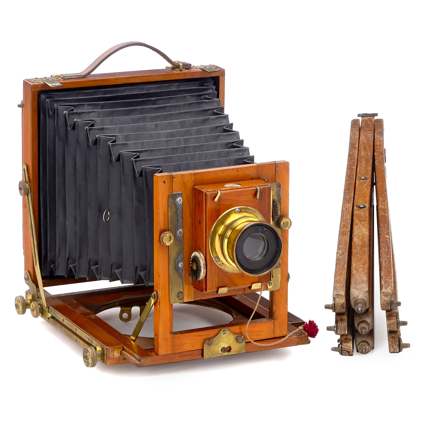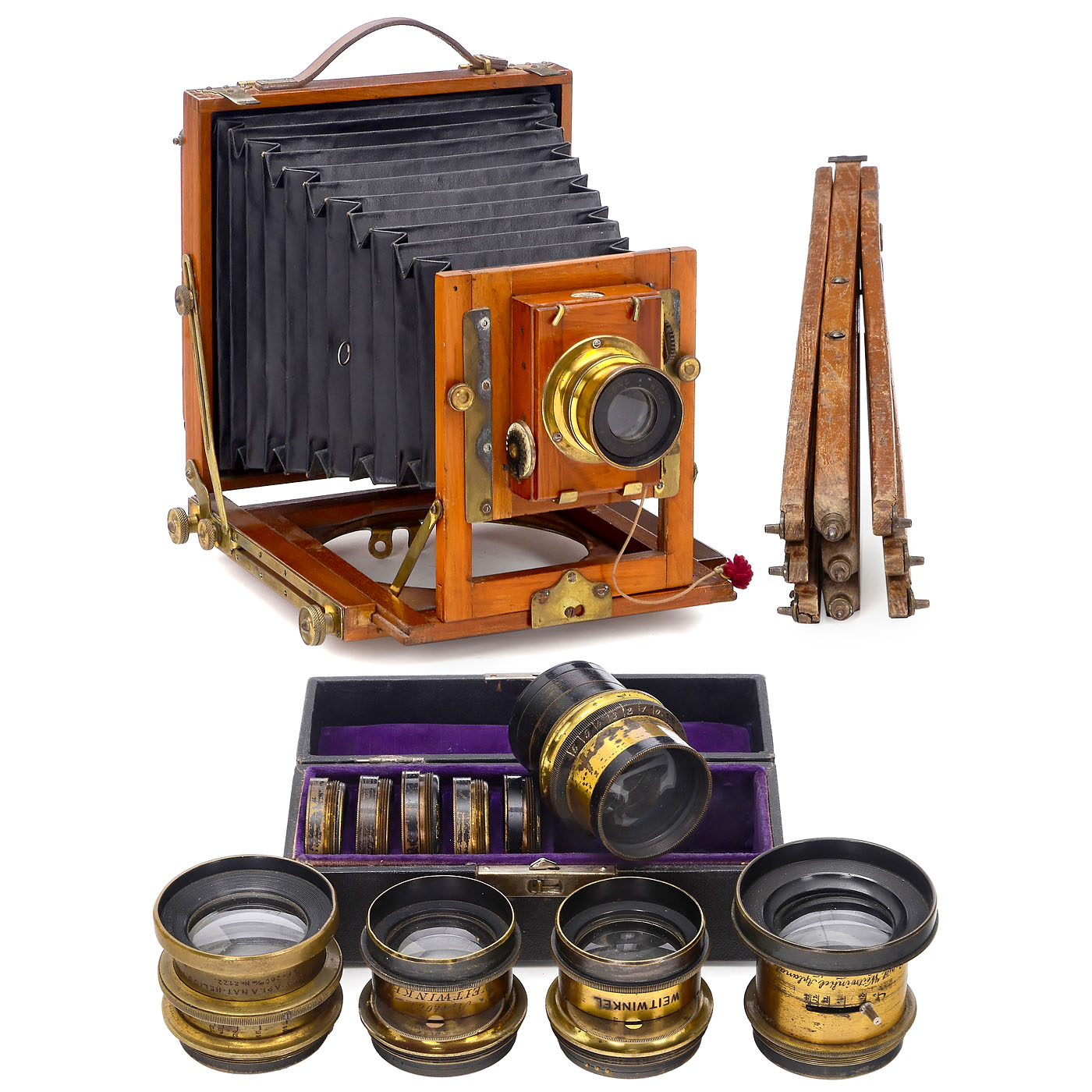 The Tella Camera Co., 110 Shaftesbury Ave., London. For 12 x 16.5 cm plates, the front standard is attached to the front (wooden joint loose in one spot, should be glued), the Thornton-Pickard shutter operates, and the thread of the screw-on ring on the lens board fits all included Aplanat or wide-angle Aplanat lenses from Beck and other manufacturers in 15, 17, 23, 25, and 26 cm, as well as for the complete 8-piece Aplanat lens set in a case, with a matching tripod for the rotating ring on the camera base, a removable back with focusing screen back (focusing screen replaced). A rare example of such extensively preserved camera equipment!