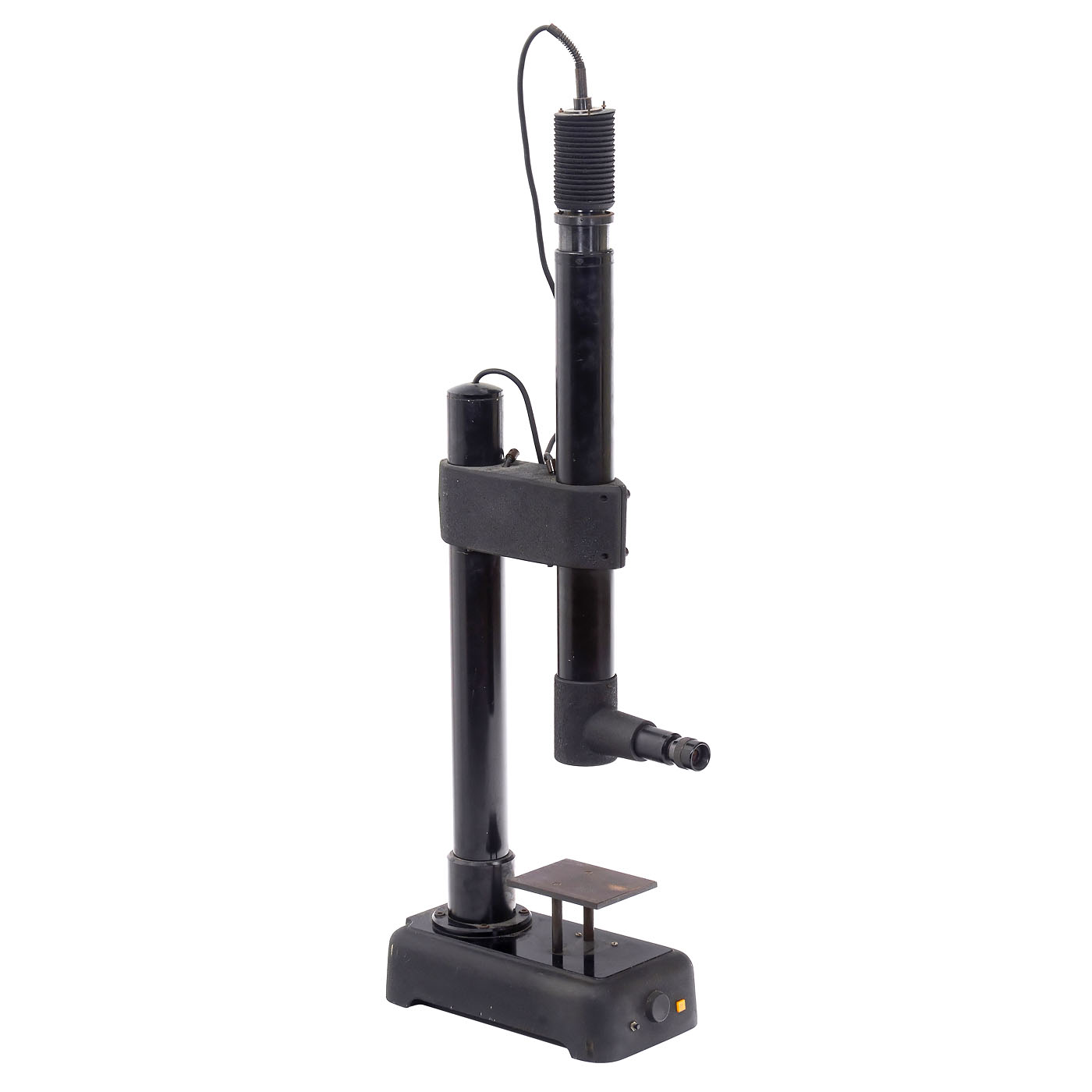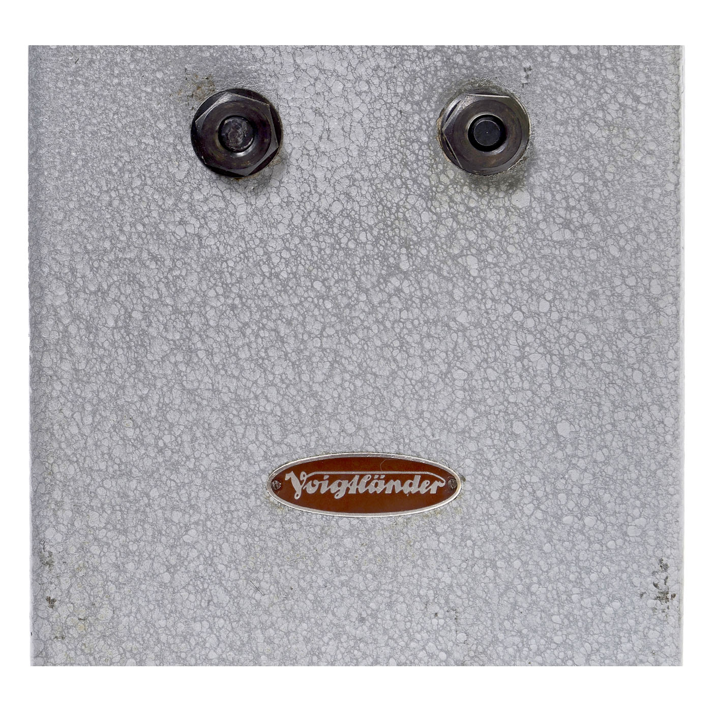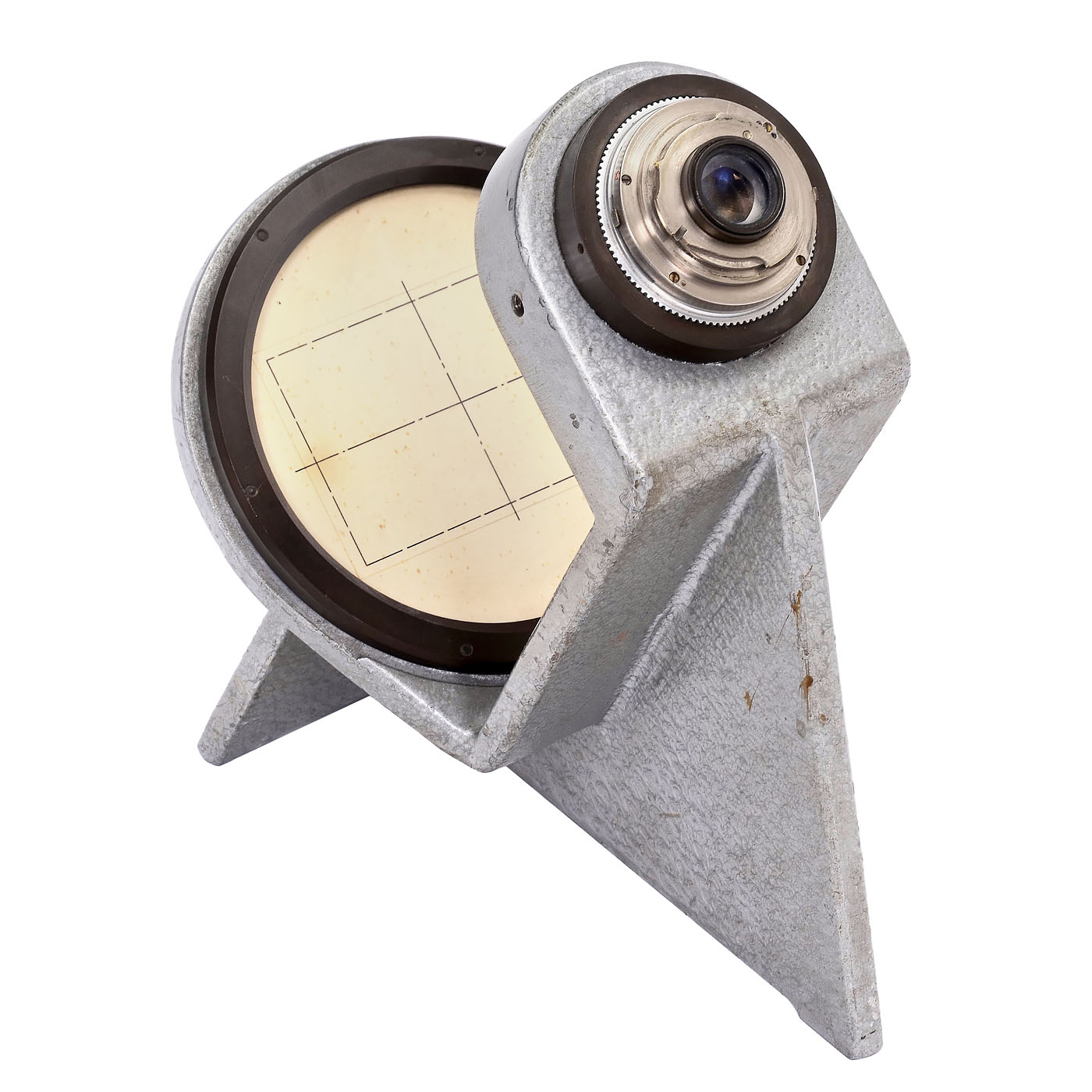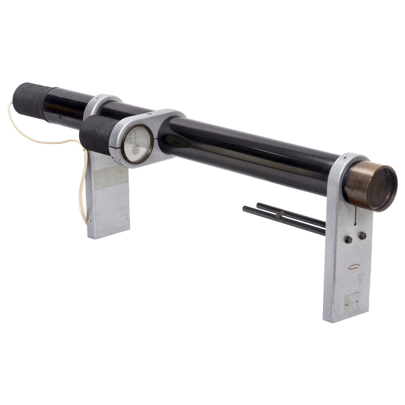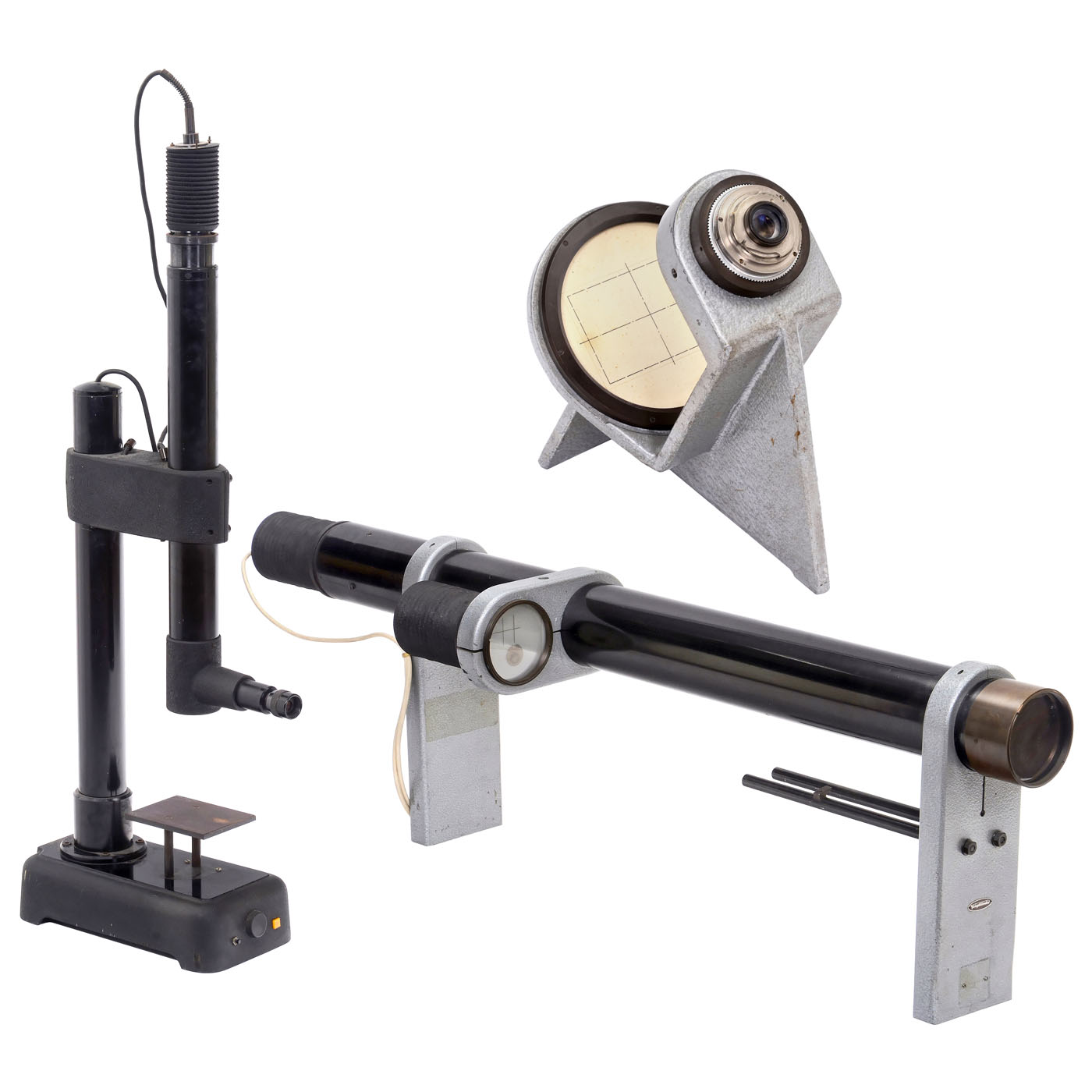 Voigtl?nder, Braunschweig. Impressive factory-made devices from the 1950s, from the heyday of the German camera and optics industry or why Voigtl?nder was able to advertise it: "Why the lens is so good!". 1) Collimator, horizontal type, length 157 cm, height 45 cm, an opal disc is used to display two adjacent Siemens stars as if they were at infinity in a coordinate system for a lens under test. Optical focal length is estimated at 120 cm, front lens diameter 11 cm. Next to it is an illuminated Siemens star-like test pattern with a diameter of 105 mm for testing the close range at approx. 90 cm. The electrical system is functional.