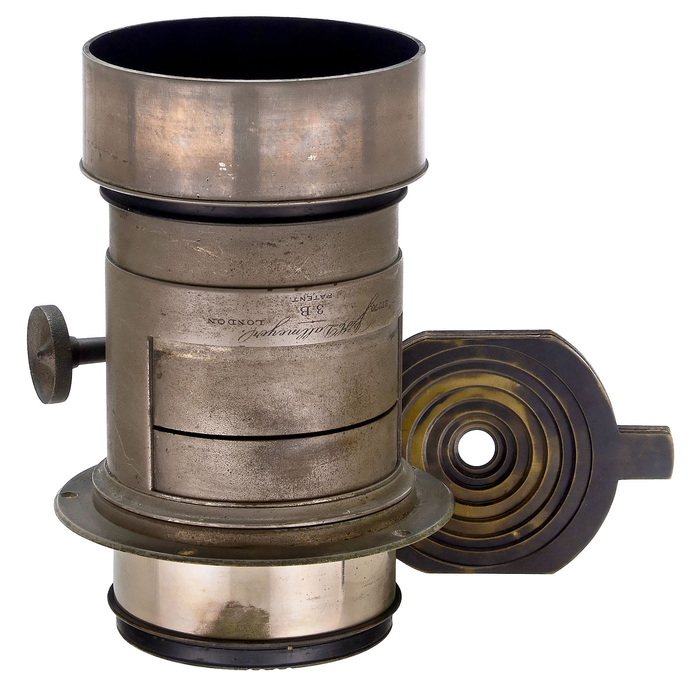 J.H. Dallmeyer, London. No. 27370, focal length approx. 11 in., for Waterhouse stops (eight included), height 8 in., front element ? 8,9 cm, threaded rear element, glass clean under point light, soft-focus movement working, drive non-operational. With screw ring.
