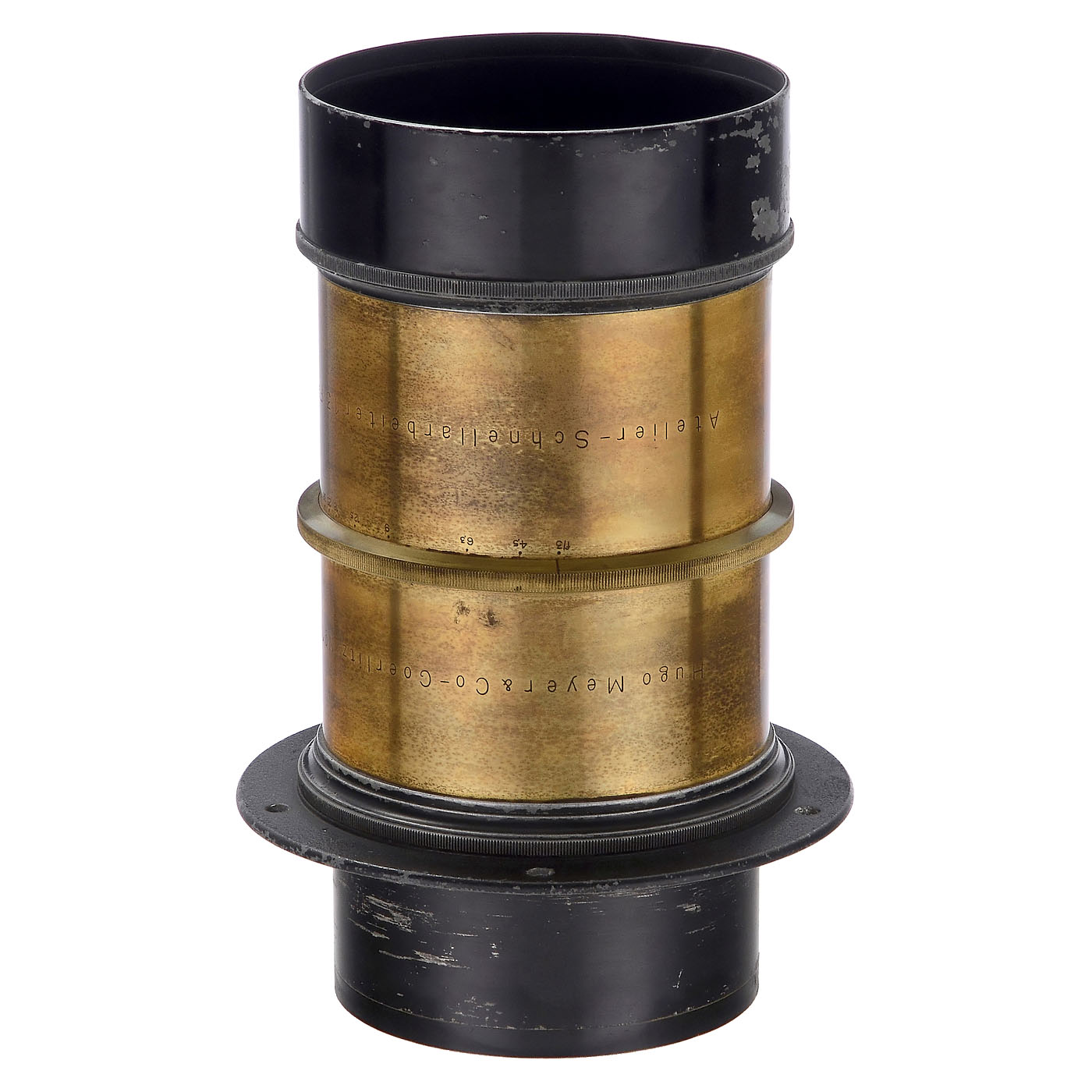 Hugo Meyer & Co., G?rlitz. Germany. No. 194646, brass lens, iris diaphragm engraved from 3 to 36, height 27 cm, diameter 14 cm, diameter of the front glass 9.9 cm. The focal length was compared at infinity with a 45 cm Apo-Tessar. This Schnellarbeiter lens has a focal length of approx. 46 cm. At a 9.9 cm aperture, this is actually 4.6/460 mm and thus typical for this type of lens. The lens under point light: the rear element (fits tightly) has some age-related wear on the inside, otherwise no signs of cleaning or damage. With screw-on ring. Impressive lens!