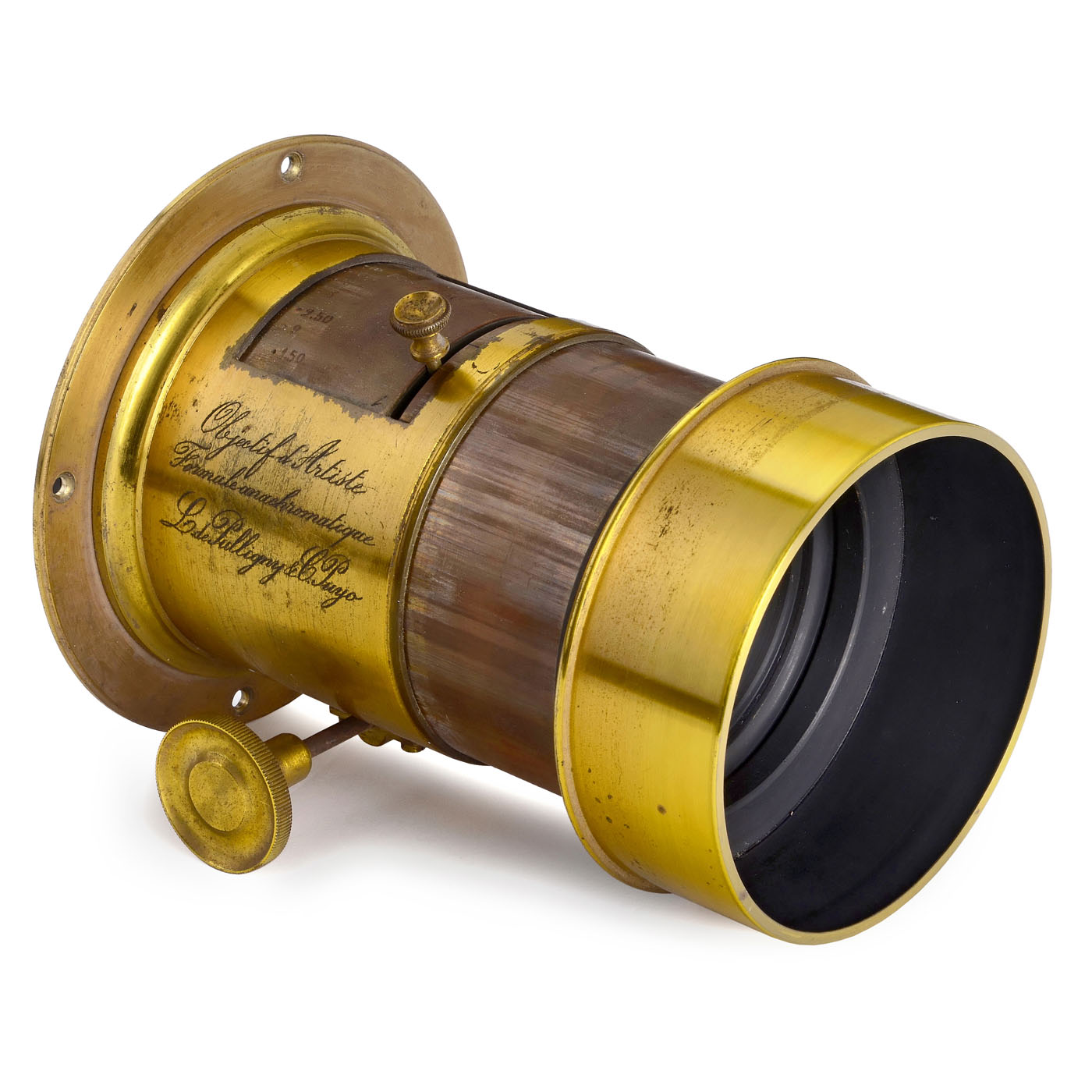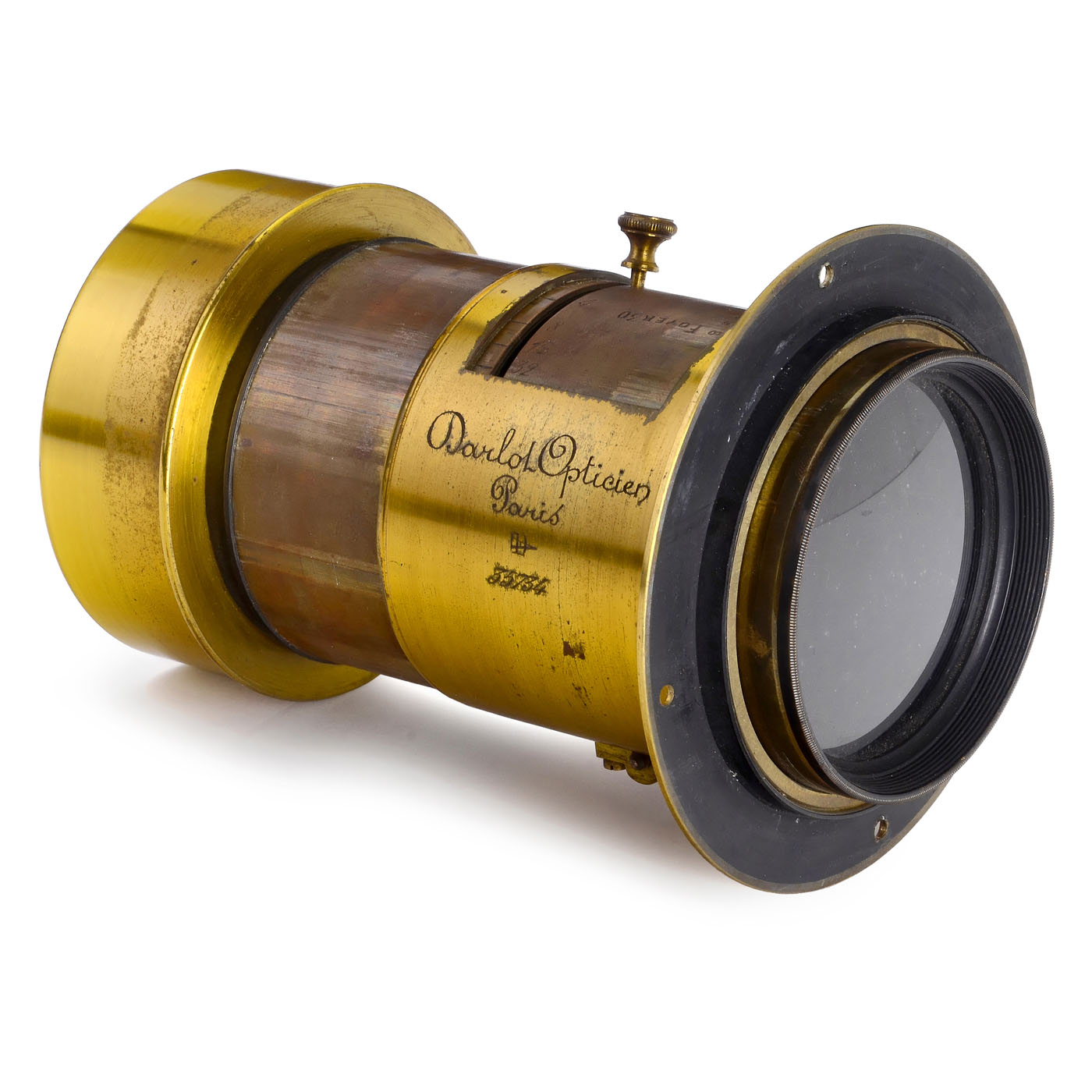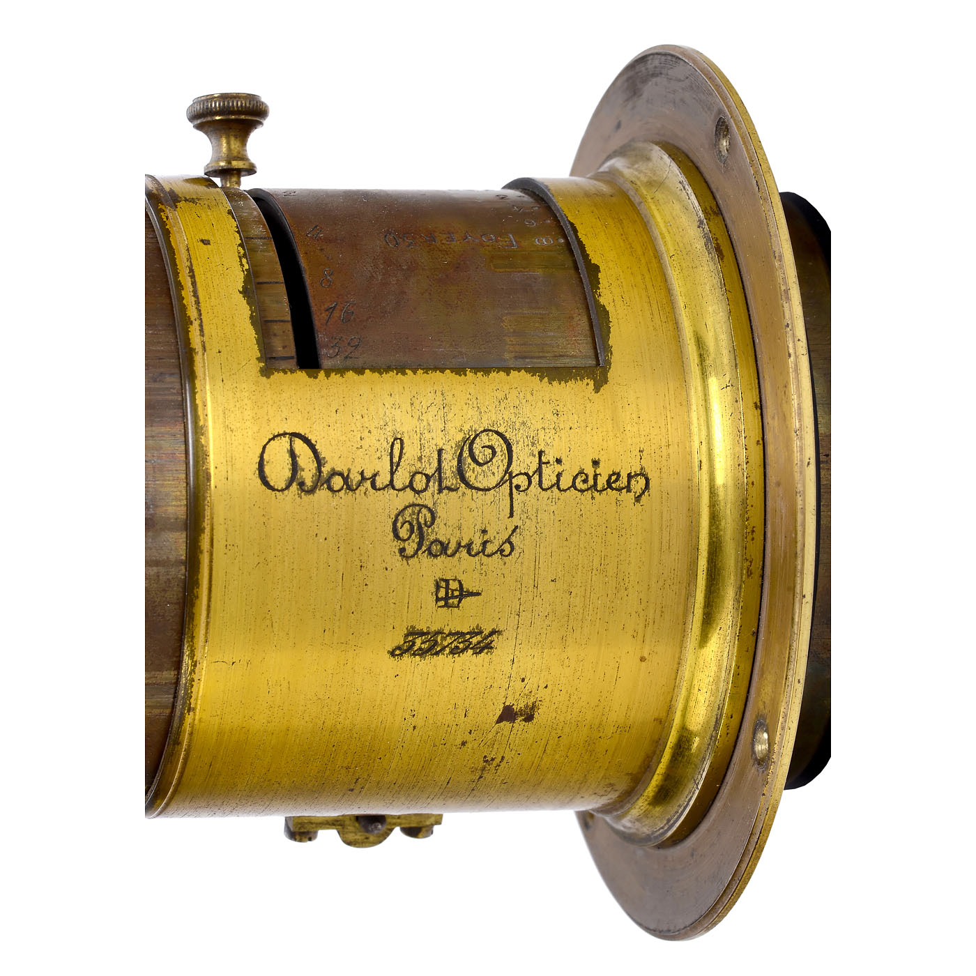 Darlot, Paris. No. 35734. Height approx. 16 cm, diameter of front element approx. 65 mm, with rack-and-pinion focusing (working) and iris stop. Equipped with two symmetrical menisci, altering the aperture setting produced the kind of artistic soft-focus effect popular during the so-called "Picturalist" period. Commander C. Puyo, one of the leading French picturalists, was involved in the design of this unusual lens. The example here uses iris stops, others were equipped with Waterhouse stop.