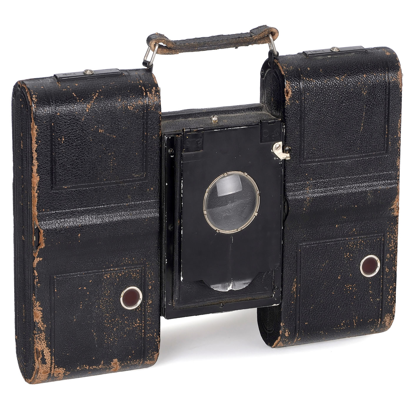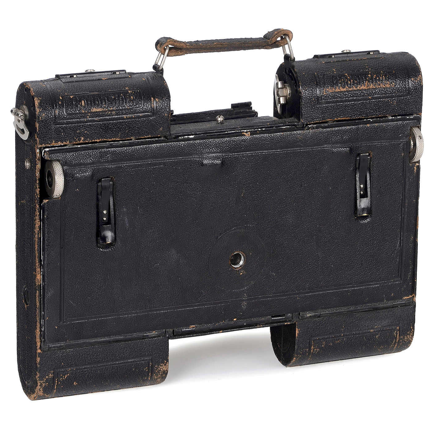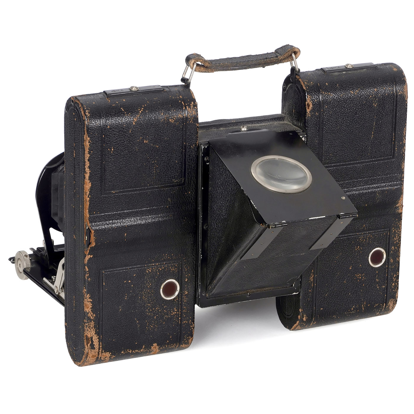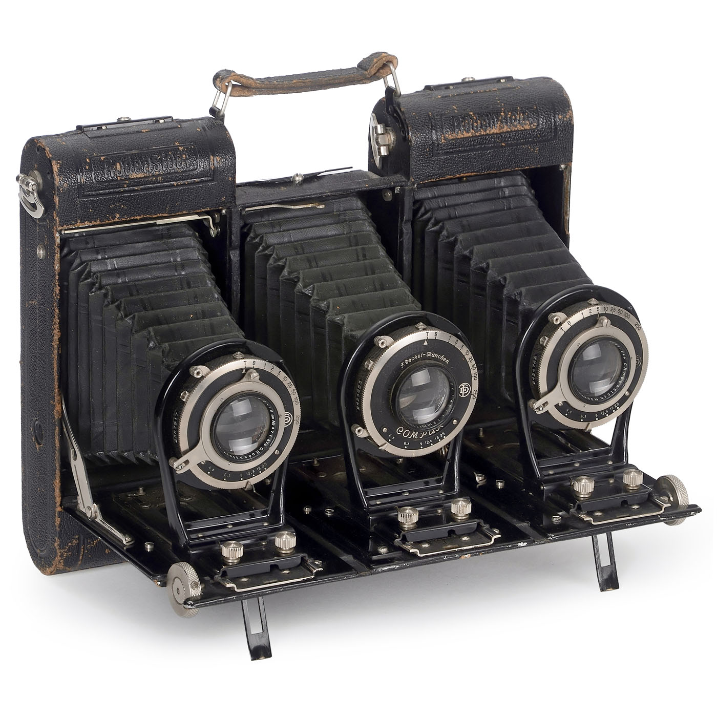Rodenstock, Munich. A very elaborate custom-made camera for comparison shots in portrait format (65 x 104 mm) on 70 mm wide rollfilm. The middle camera serves only for precise focusing using a fixed focusing screen and a folding mirror (with cracks). Common focusing for three identical Rodenstock Ysar 4.5/12 cm lenses in Compur, shutters running. The left and right lenses are designed for common shutter release. From a technical perspective, there are three possible applications: A) for special scientific stereo purposes, whereby the 18 cm stereo base is unsuitable for normal stereo photography, B) for a film emulsion manufacturer (such as Perutz) who wanted to verify quality fluctuations in their emulsions under the best possible conditions, and C) for shots where, for security reasons (military clearances?), a second exposure on another independent film is required as a backup.