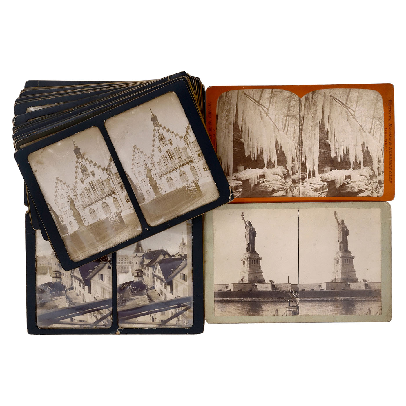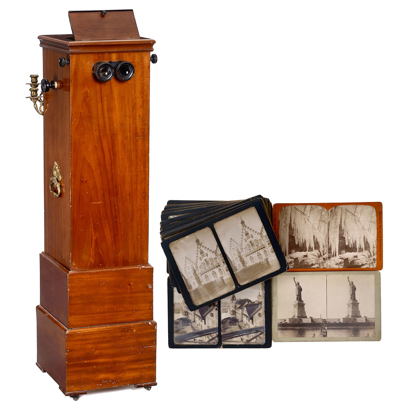 France. Conveyor belt for 200 stereo cards in 12 x 18 cm format, runs smoothly when transported forward, focusable eyepieces for those with extreme farsightedness, the mirror on the top flap (loose) is missing (replaceable), with brass carrying handles on the sides, height 130 cm, base 36 x 36 cm (sides in need of restoration), rollable, top section 33 x 33 cm, and a pivoting piano double candlestick (recast) on the back for illumination.