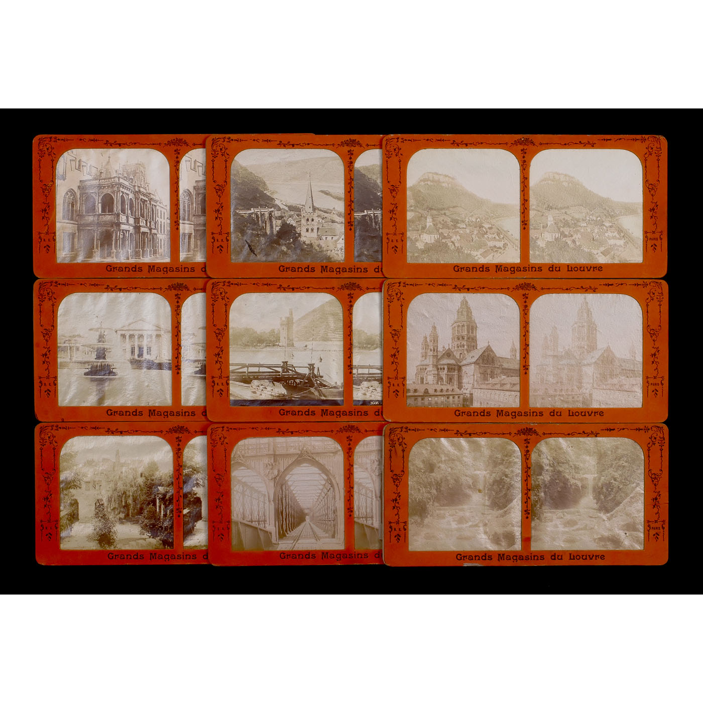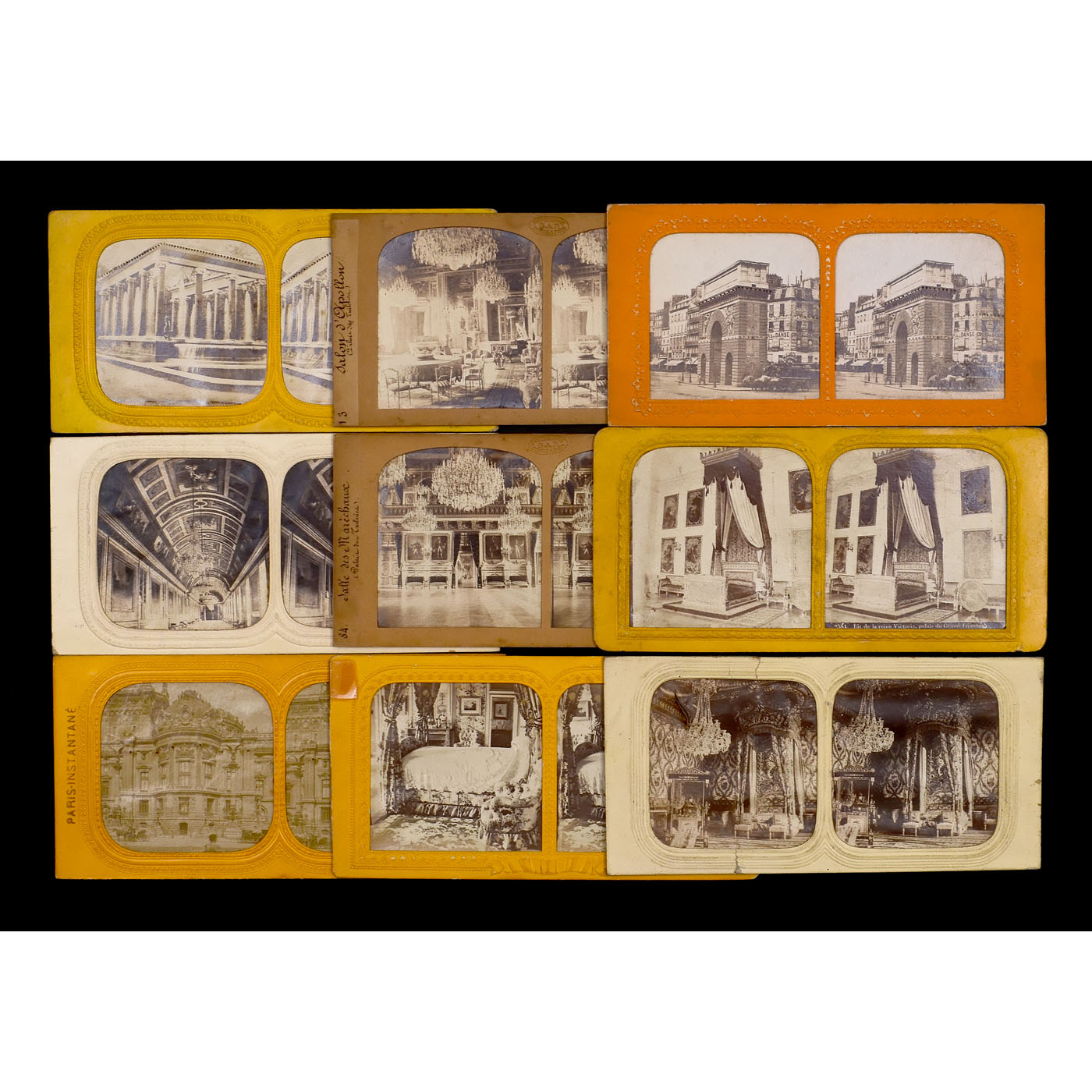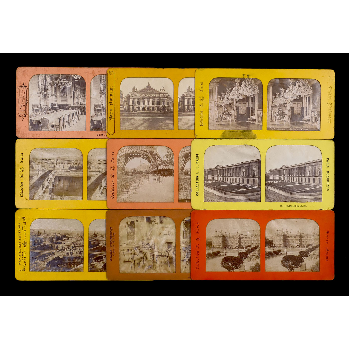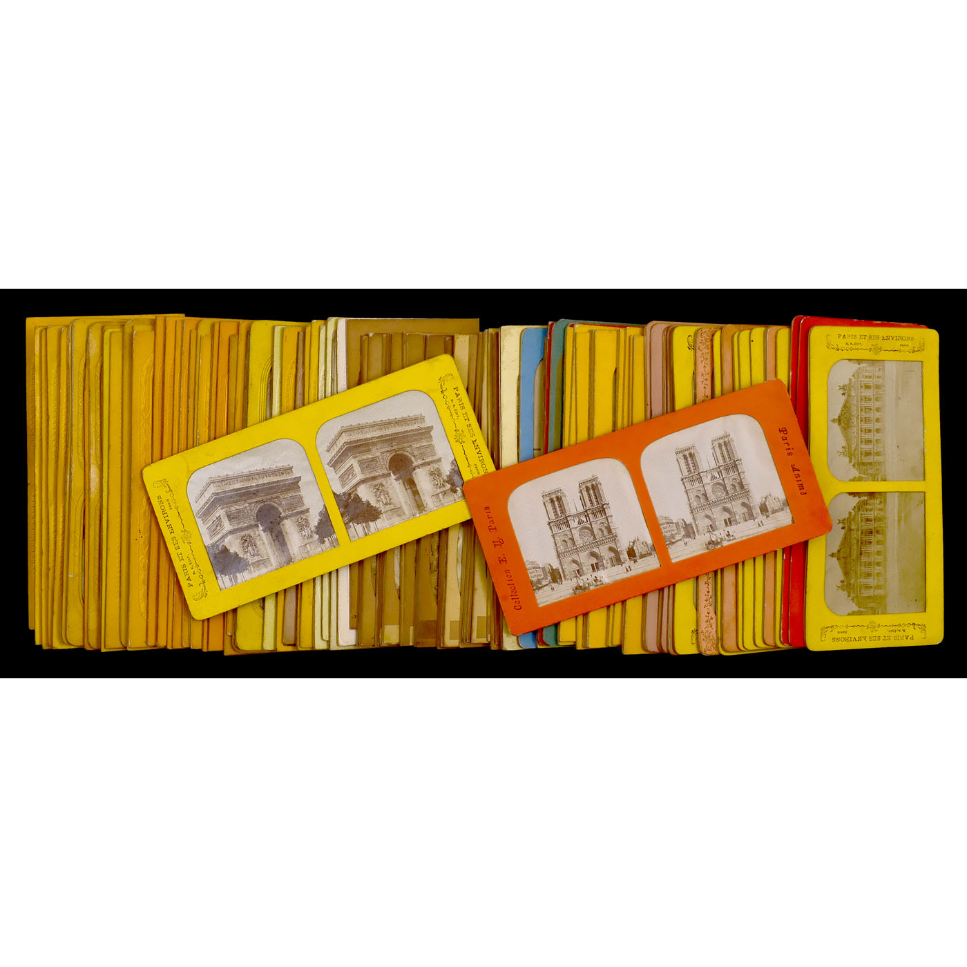 Approx. 130 stereo tissues 9 x 18 cm for normal view and by viewing as colored transparencies with effect engravings, of which 119 alone are of Paris featuring sights, exhibitions, and street scenes. All stereo cards are in average condition (a few with tears): 25 x "G.A.F. Photographie", 47 white or yellow to orange cards with embossed frames, 23 smooth cards with overprints, 19 smooth cards, and Th