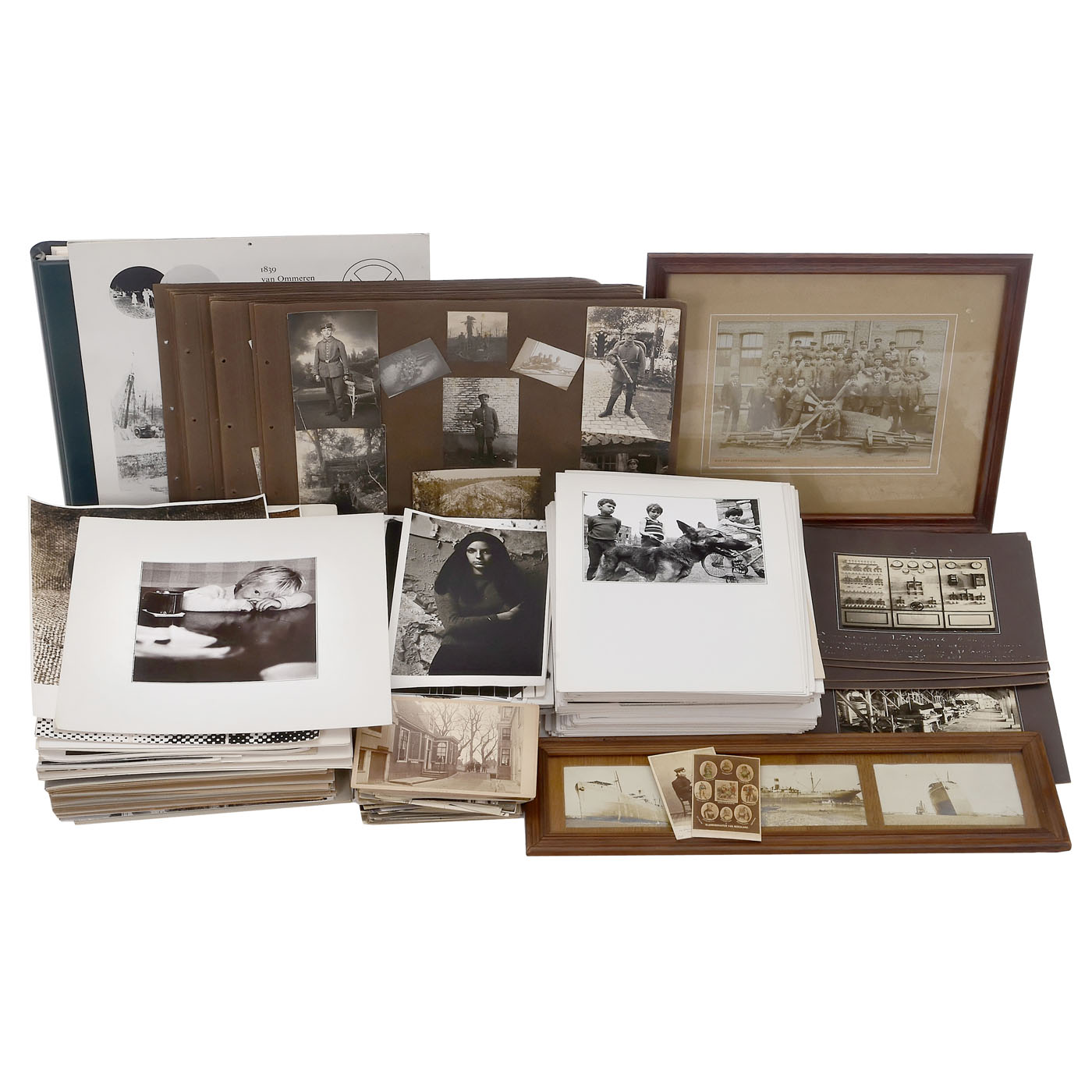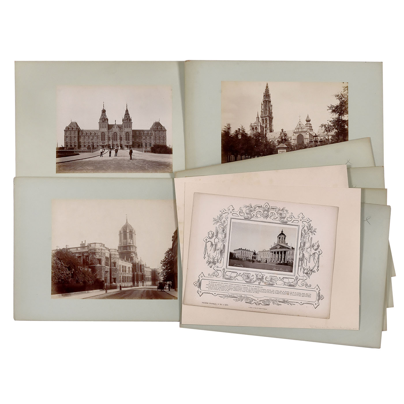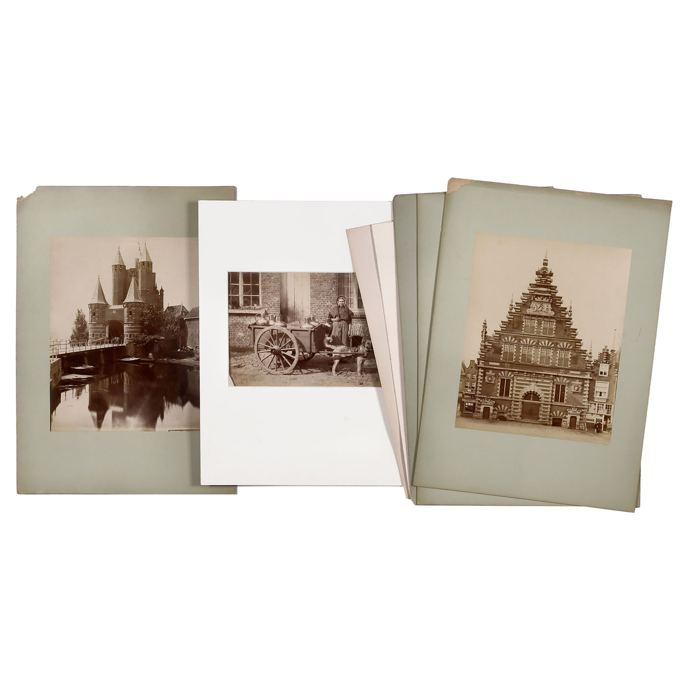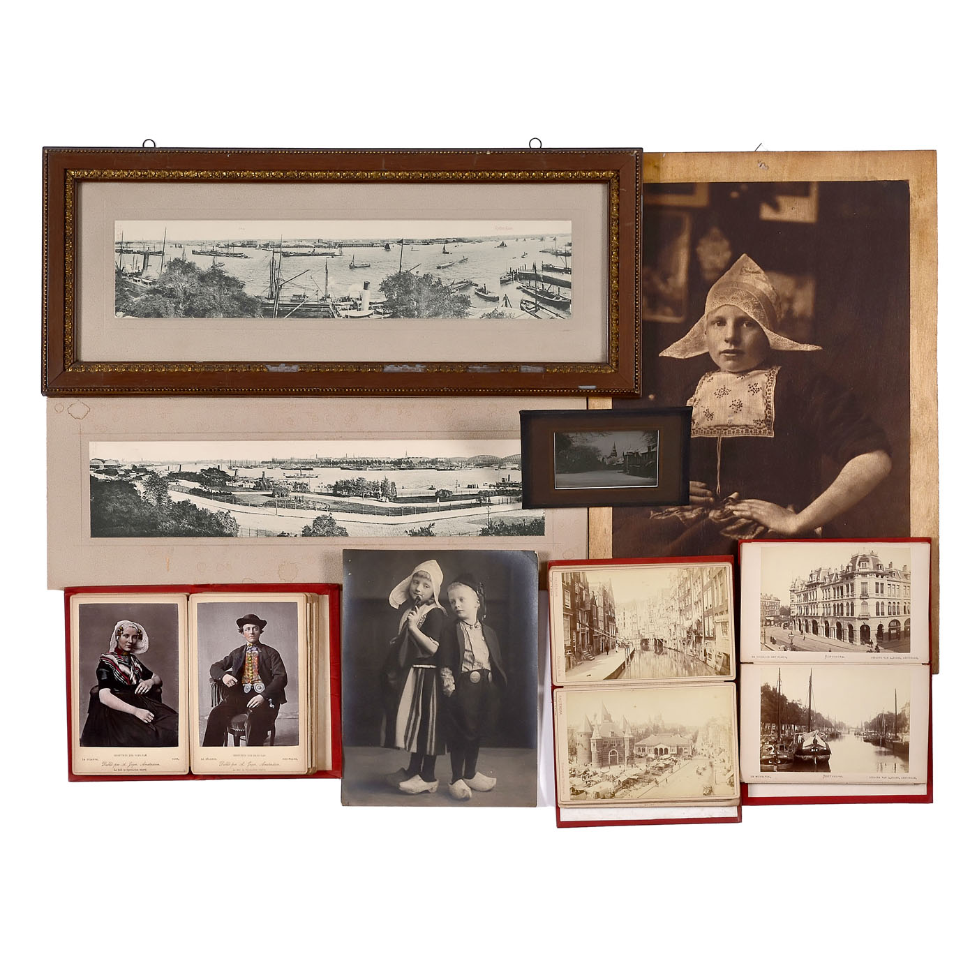 Extensive collection from the beginnings of photography to the modern era, no color photographs. Ranging from a 6 x 9 cm daguerreotype to approx. twenty 24 x 30 cm albumen prints of churches and buildings, including Antwerp, three small albums "Souvenir de Rotterdam," "Souvenir de la Hollande," and "Album de Costumes de Pays-Bas," album sections with views of the colonies, two panoramic photographs, and a 24 x 39 cm woodcut. Also included is an extensive collection of artistic photography from the period 1930 to 1960 by unknown photographers, mostly mounted formats 18 x 24 to 24 x 30 cm.
