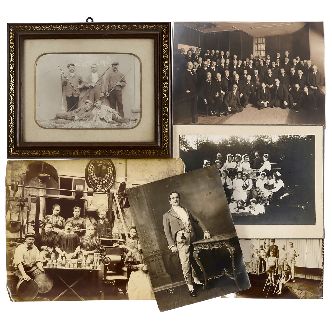 All of these photographs show a hint of the specific Rhineland way of life, which is characterized by not taking things too seriously (respectable men sit on the floor next to the apprentices) or of exaggeration, which August Sander developed even further. Unfortunately, none of these photographs are by him. There are 3 framed and 35 unframed photographs in formats from 13 x 18 to 23 x 28 cm, some mounted on cardboard. Pictures suitable for exhibitions, well-preserved.