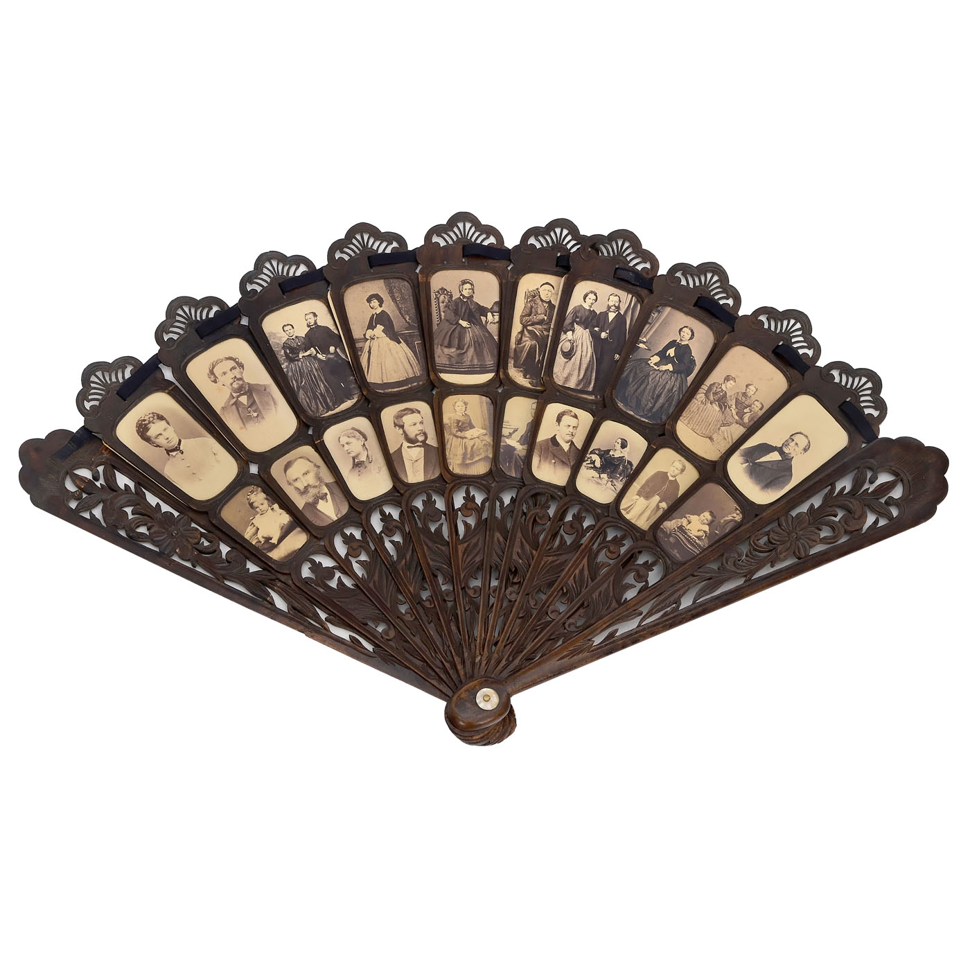 Carved wooden fan with floral decoration, holding 10 Cartes de Visite and 10 Mignon-sized cards each, height 34 cm, open to 58 cm. A striking decoration for a photography studio, filled with images by photographers from all over Europe. A rarity!