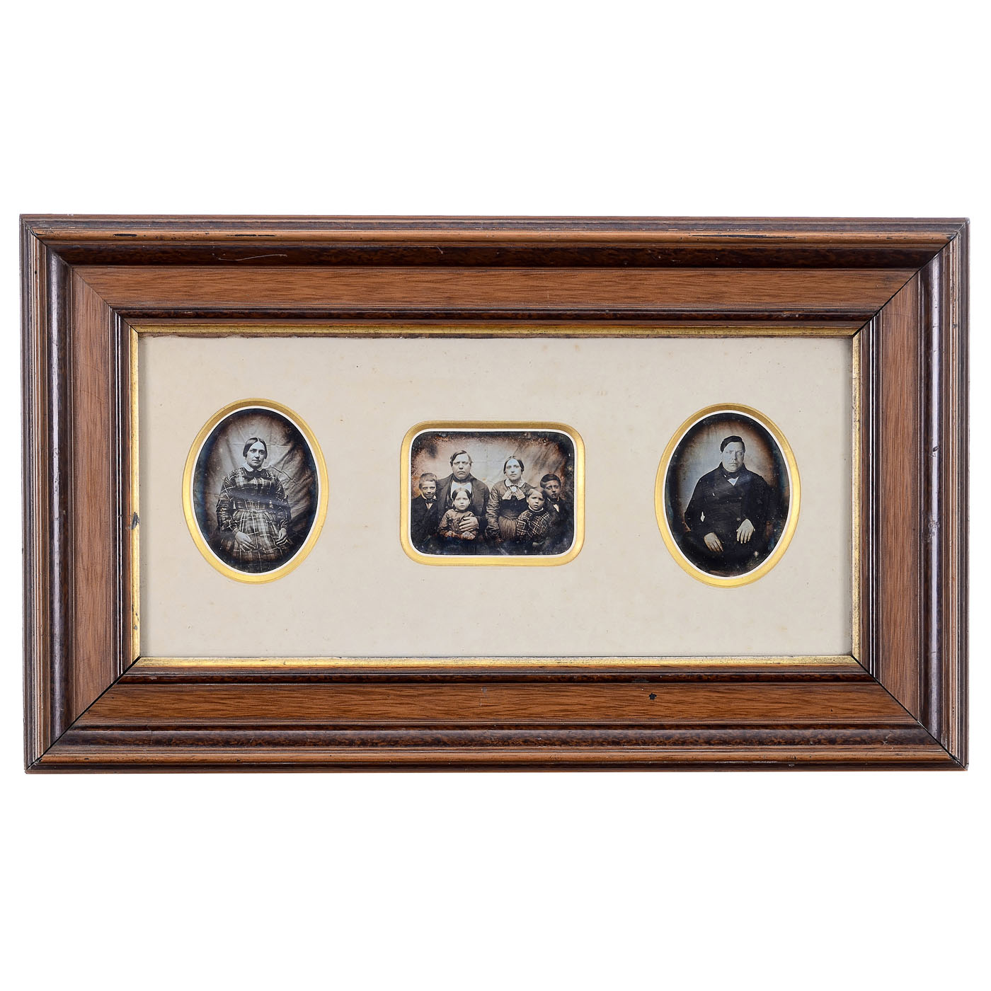 Presumably Germany. Very rare multiple daguerreotypes in a single frame measuring 48 x 28 cm. The two individual photographs depict a young couple c. 1850, followed 10 years later by a family photograph with four children. Presumably another 10 years later, the frame for these three images was created as an unbreakable unit, with barely legible pencil annotations on the verso. Very well preserved!