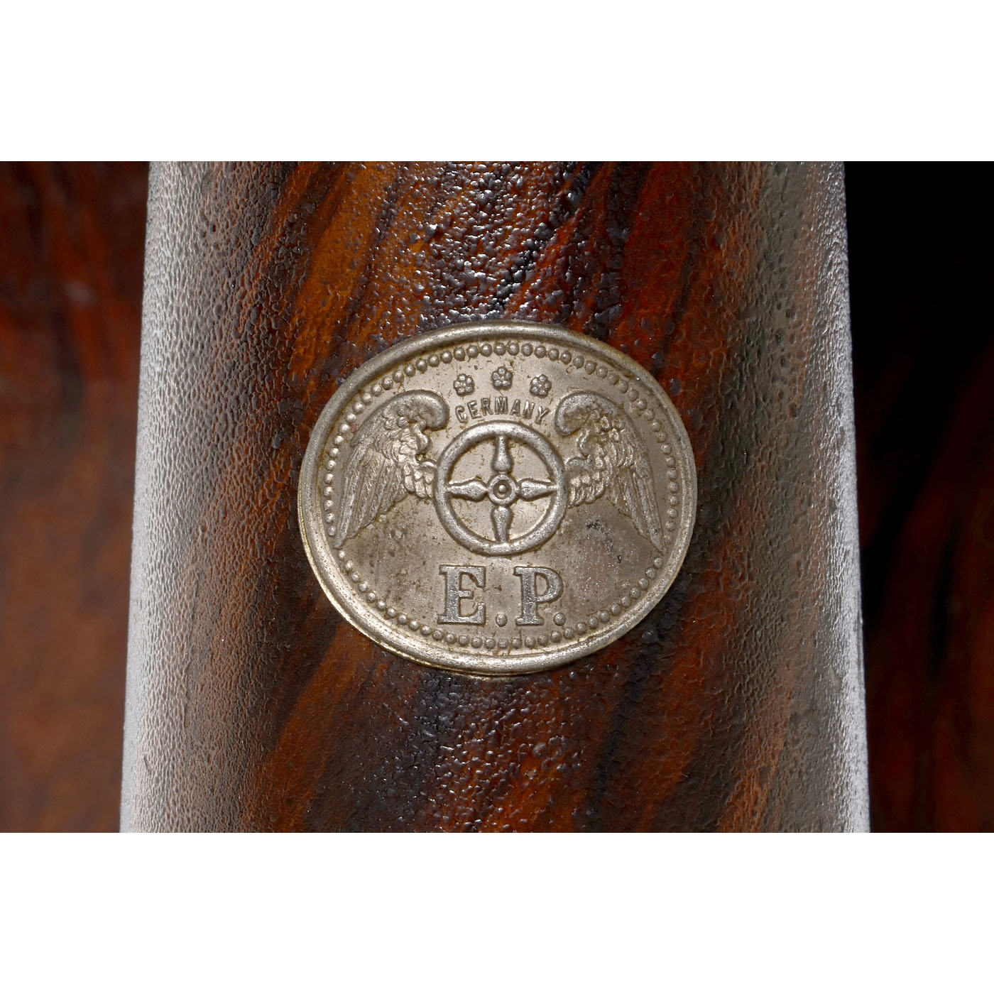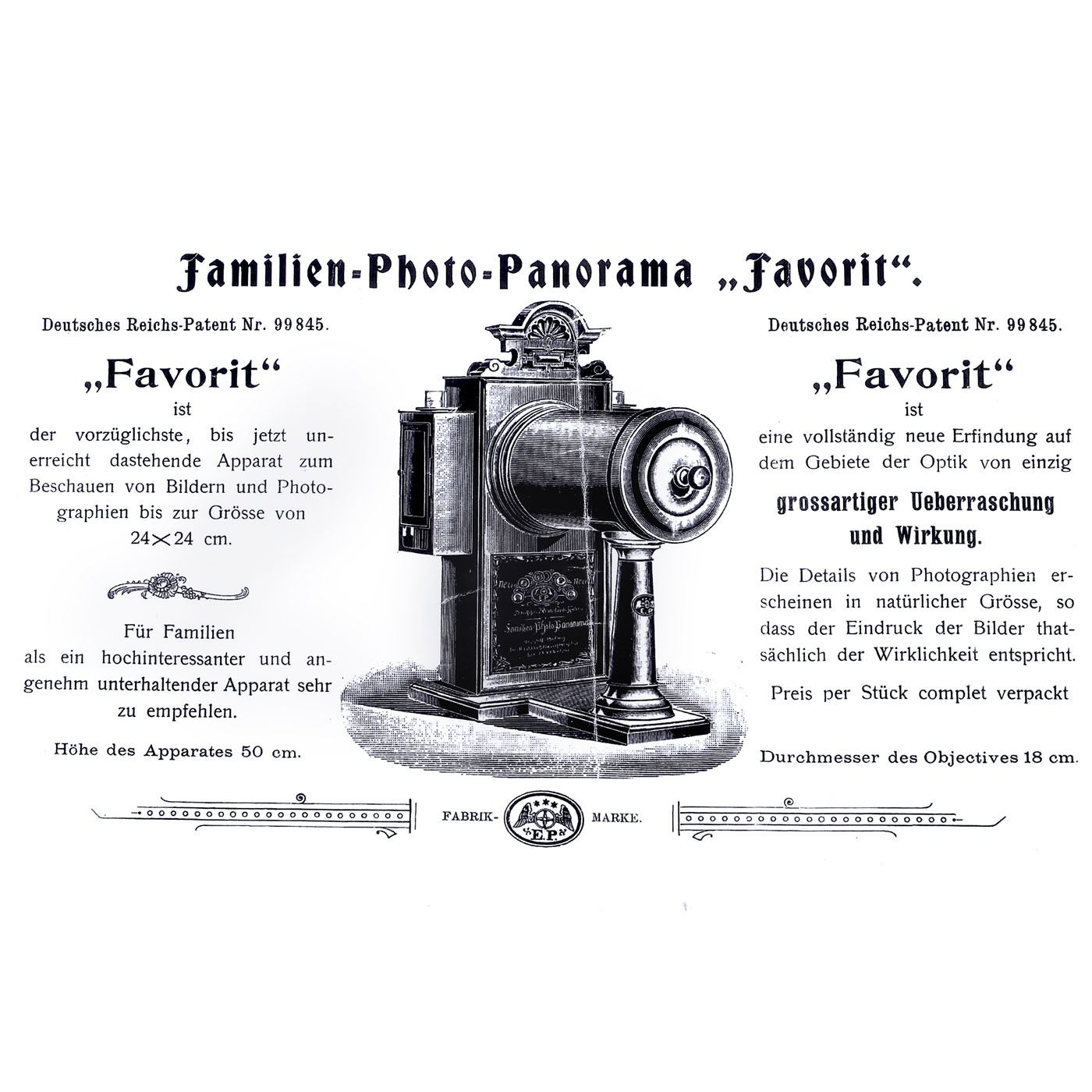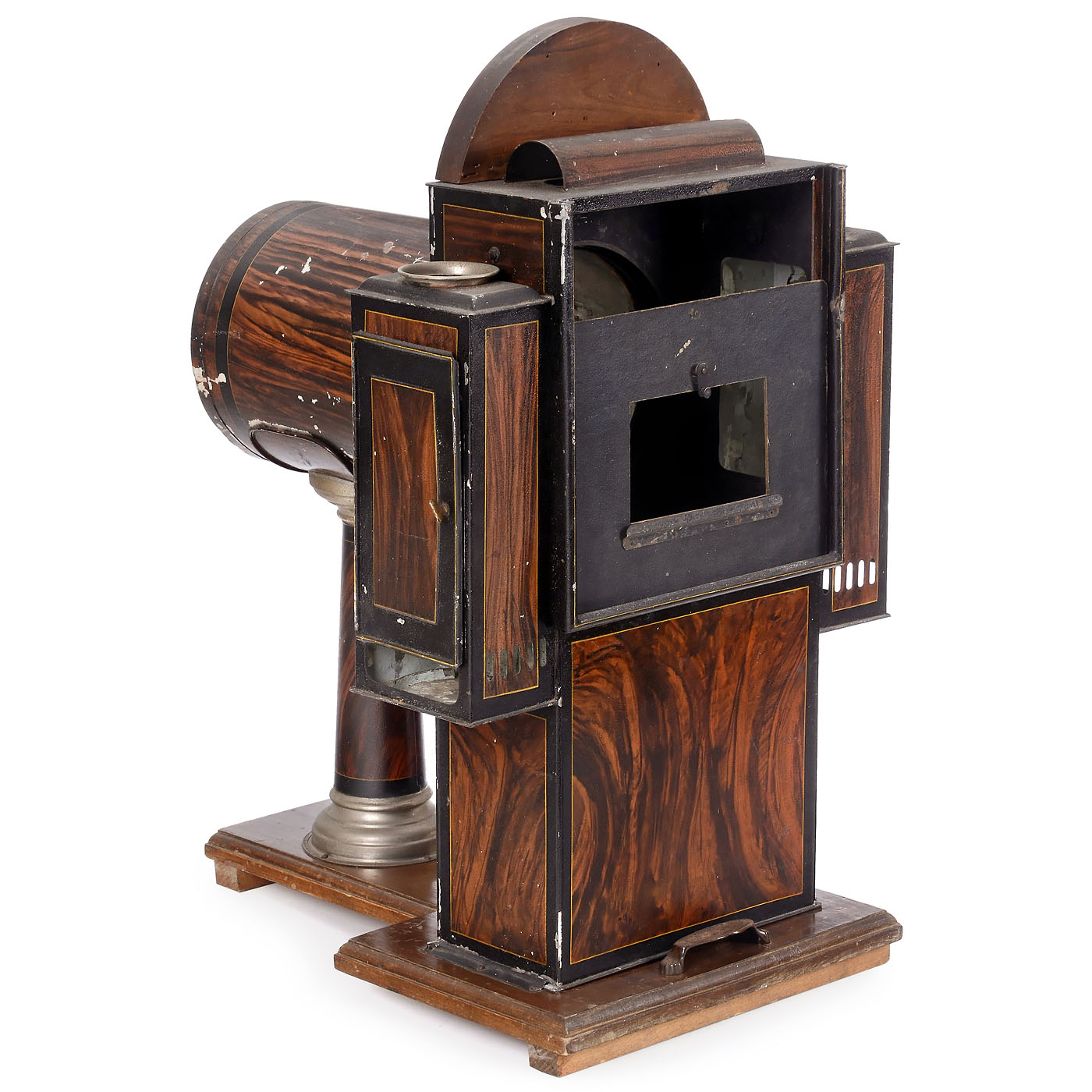 Ernst Plank, Nuremberg. Viewing device for images up to 22 cm in side length. Designed by Carl Bourdon of Kassel, Germany. (DRP 99845). Sheet metal housing with hand-painted imitation wood, 64 cm high, the large 19 x 28 cm viewing lens for looking inside (not a projection lens!). It features two (of the five specified by the patent) biconvex lenses, each with a focal length of 90 cm.