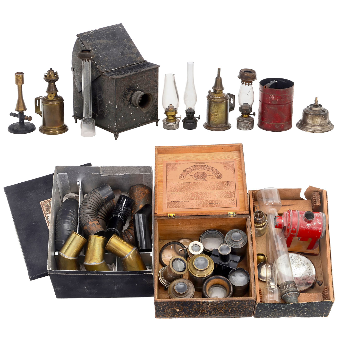 1) Camera obscura, metal housing, image size 14.6 x 13 cm (focusing screen missing), focal length correct for infinity, one foot missing.