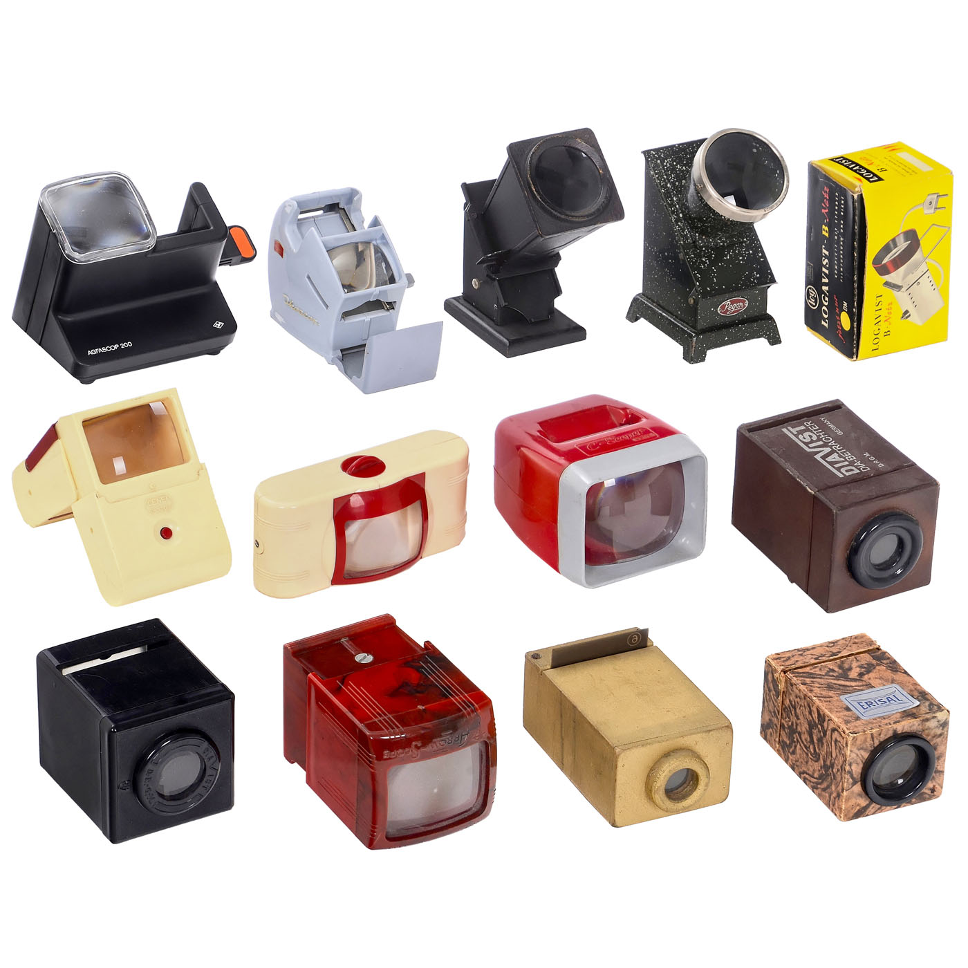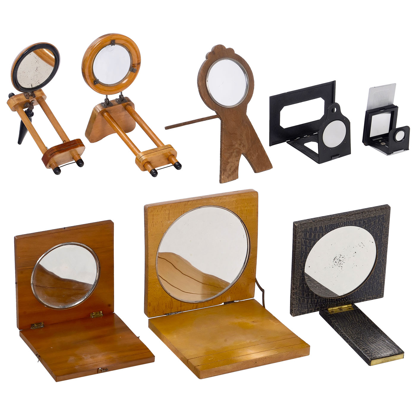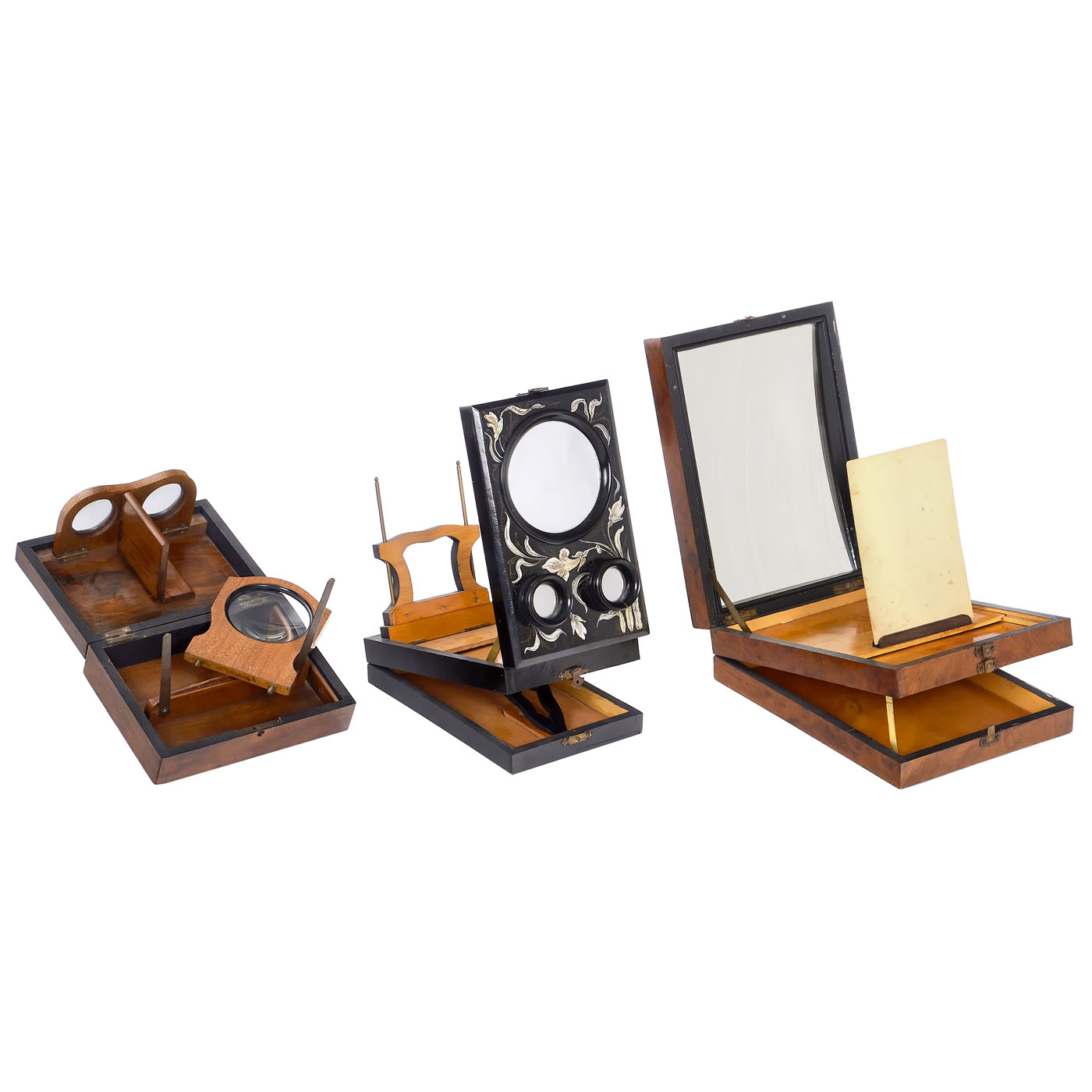 1) Reflectoscope as a zograscope, c. 1870, rectangular concave mirror viewer 24 x 17.5 cm in a burlwood veneer case 20 x 27 x 9 cm, with card holder for cabinet cards. Rare!