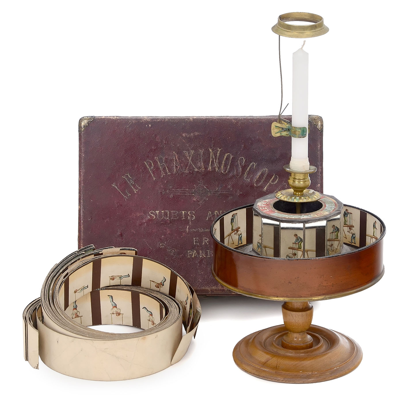?mile Reynaud, Paris. Original box, metal drum painted inside, ? 22 cm, all mirrors replaced, candle holder with holder for lampshade, with 26 picture strips 5.4 x 65 cm of a 30-part series, all titled, some with creases (no. 15 glued).