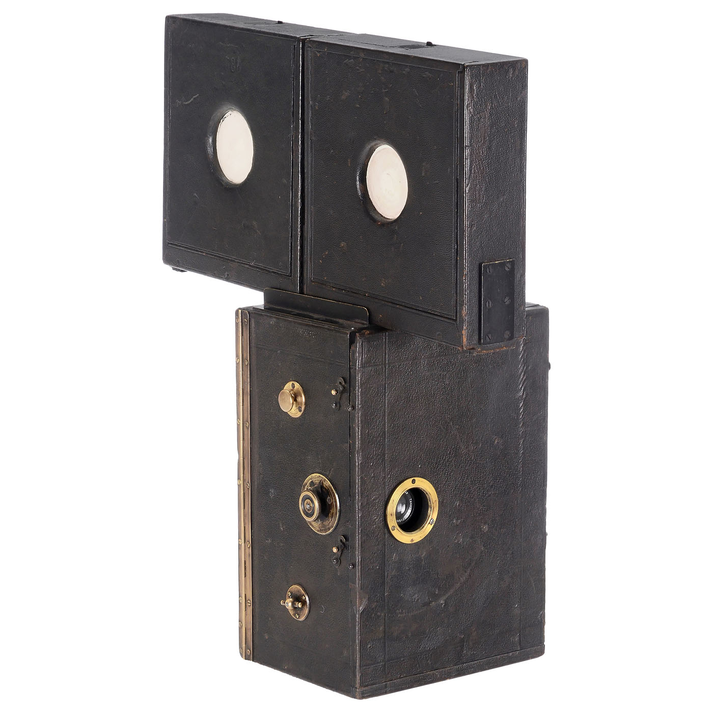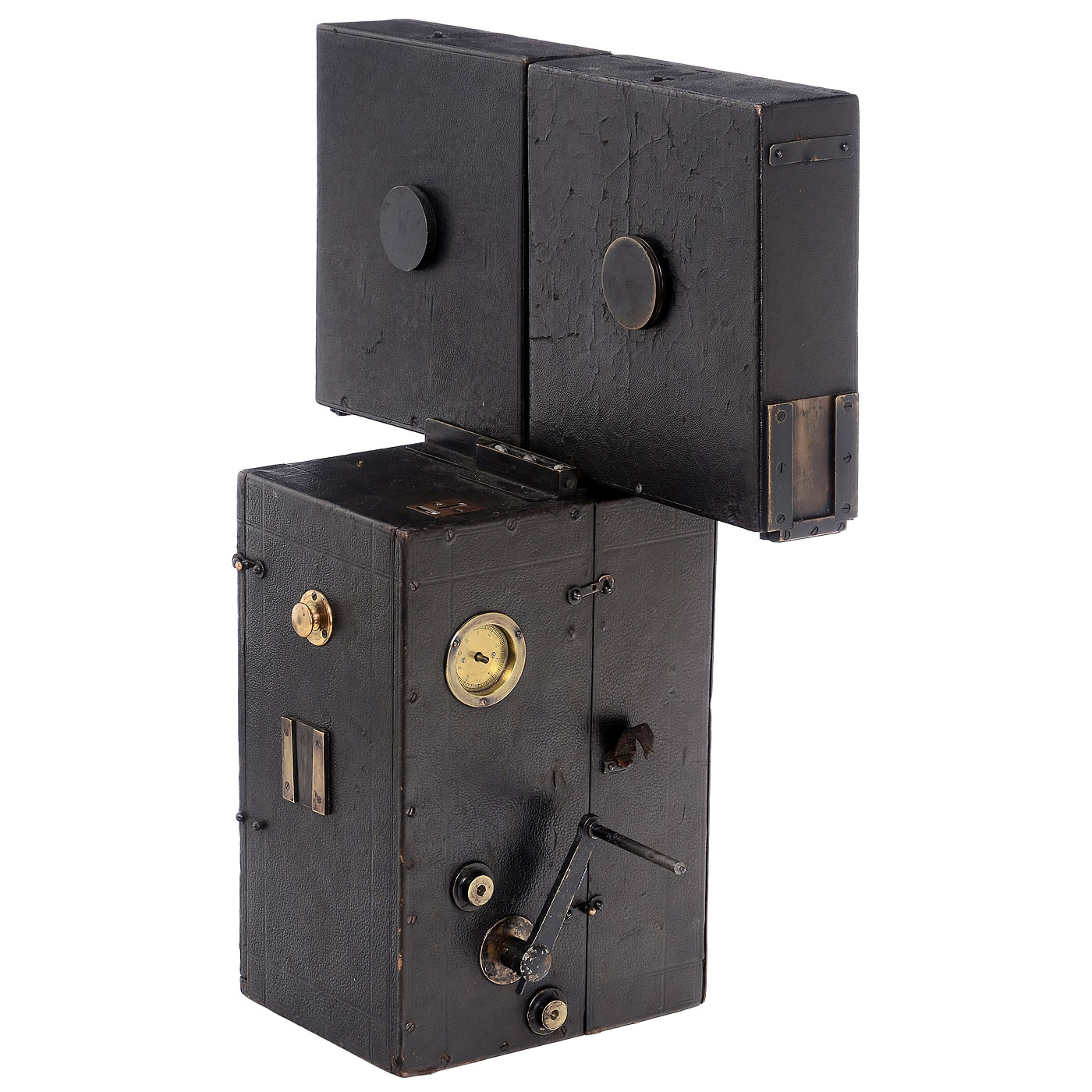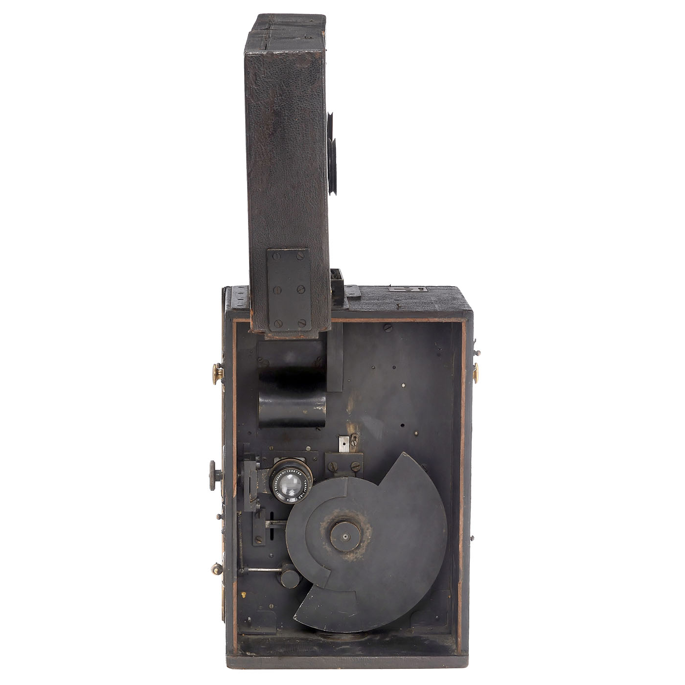 Cinématographes Pathé Frères, Paris. Film camera for 90m reels in two outer cassettes. Double-claw gripper. Drive: rear hand crank (not original). Lens: Zeiss Jena Tessar 3.5/60 mm. An early version of this camera type still lacking the later rear magnifying glass of the "film as a focusing screen" viewfinder system.
