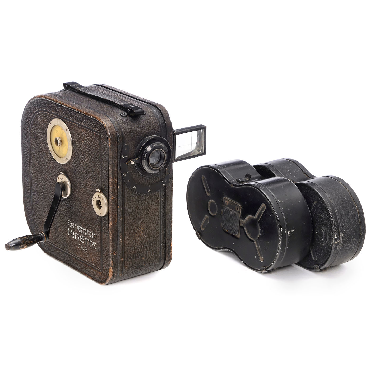 Ernemann-Werke, Dresden. Camera for 35mm film in 30m single-chamber cassettes (3 included). Lens: Ernostar 2/35 mm, the fastest lens of its time (front lens without cleaning marks, point light not possible). Newtonian viewfinder on the camera body. Stepping system: single-sided claw. Drive: handcrank via single-gear or eight-gear axle.